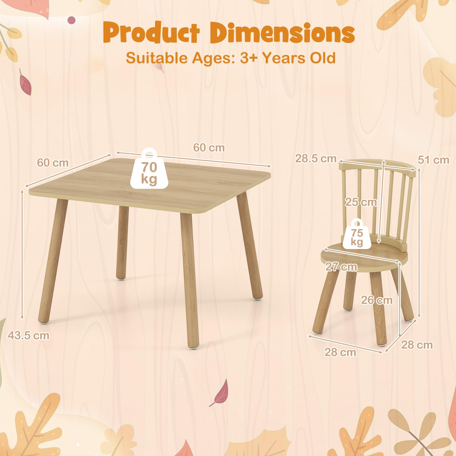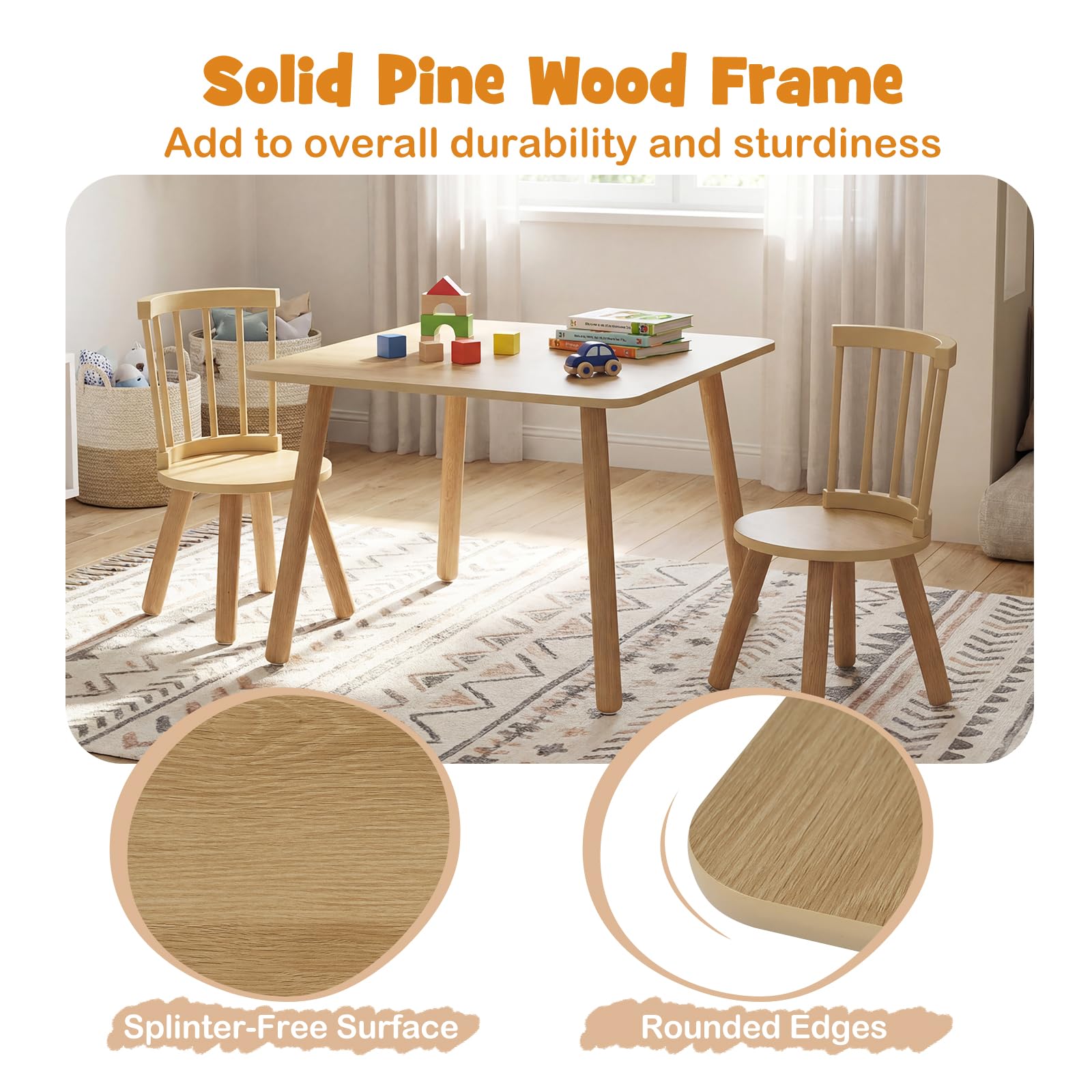 - Stable Construction: Children's chair legs and table legs are made of natural solid wood, which ensures special stability and durability. The smooth and splinter-free surface protects delicate kids’ hands and provides safe support in daily use.