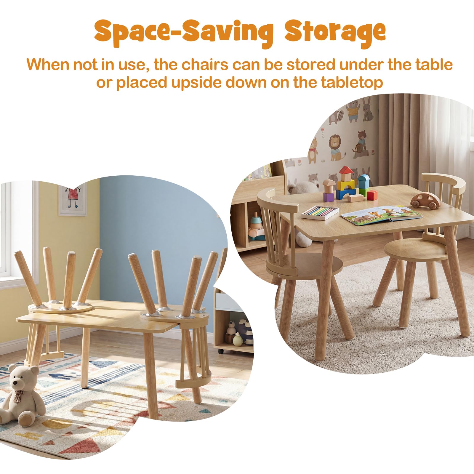 - Practical Furniture Set: The kids table with chairs features a spacious tabletop, where books, dolls, snacks, or building blocks are always within reach. And ample space remains for creative activities, learning or play, making it perfectly suitable for multiple daily situation.