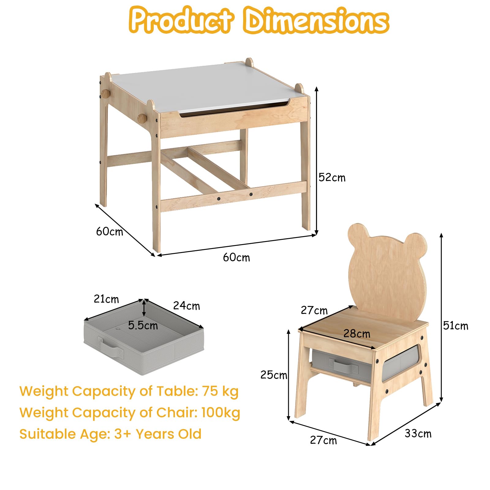 The activity table features a reversible tabletop that allows kids to transition between a smooth whiteboard and a classic chalkboard surface. Beneath the table is a large hidden storage compartment for stashing toys, art supplies and books, keeping the play area tidy. Additionally, 2 removable and foldable fabric drawers offer extra space to store items. Adding further convenience, 2 solid wood sticks are positioned inside the desk - serving dual roles as paper roll holders and handy hooks. Crafted from solid wood composite board, this kids table and chair set is built to last. Moreover, the lovely panda/robot-shaped backrest adds a playful touch to any playroom or nursery.