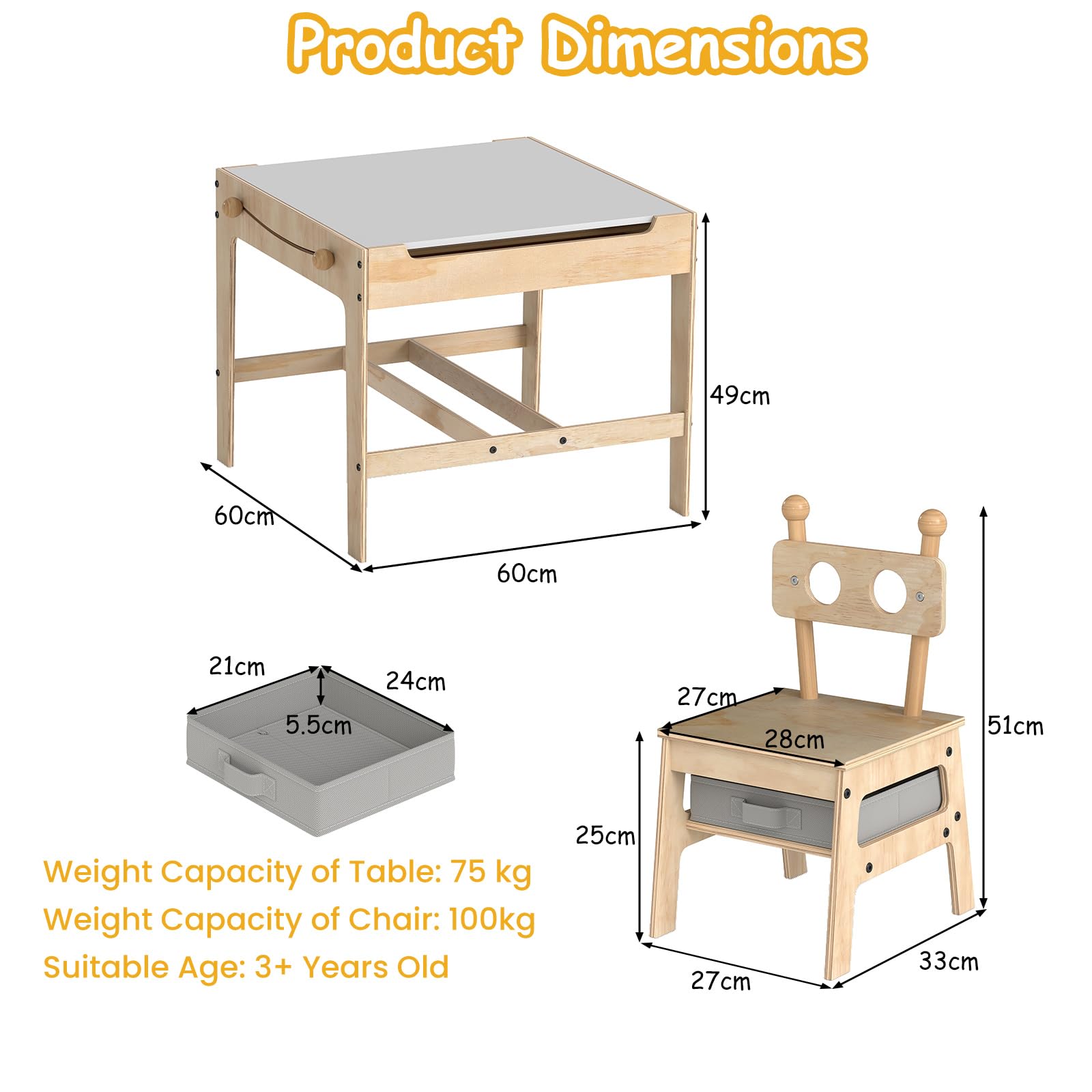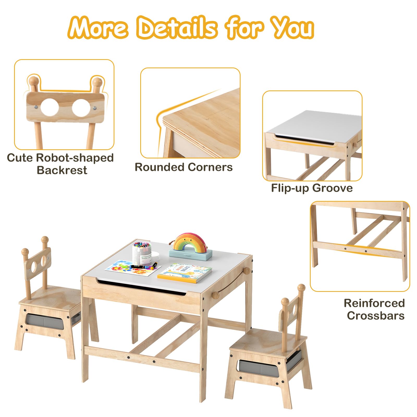 The activity table features a reversible tabletop that allows kids to transition between a smooth whiteboard and a classic chalkboard surface. Beneath the table is a large hidden storage compartment for stashing toys, art supplies and books, keeping the play area tidy. Additionally, 2 removable and foldable fabric drawers offer extra space to store items. Adding further convenience, 2 solid wood sticks are positioned inside the desk - serving dual roles as paper roll holders and handy hooks. Crafted from solid wood composite board, this kids table and chair set is built to last. Moreover, the lovely robot-shaped backrest adds a playful touch to any playroom or nursery.