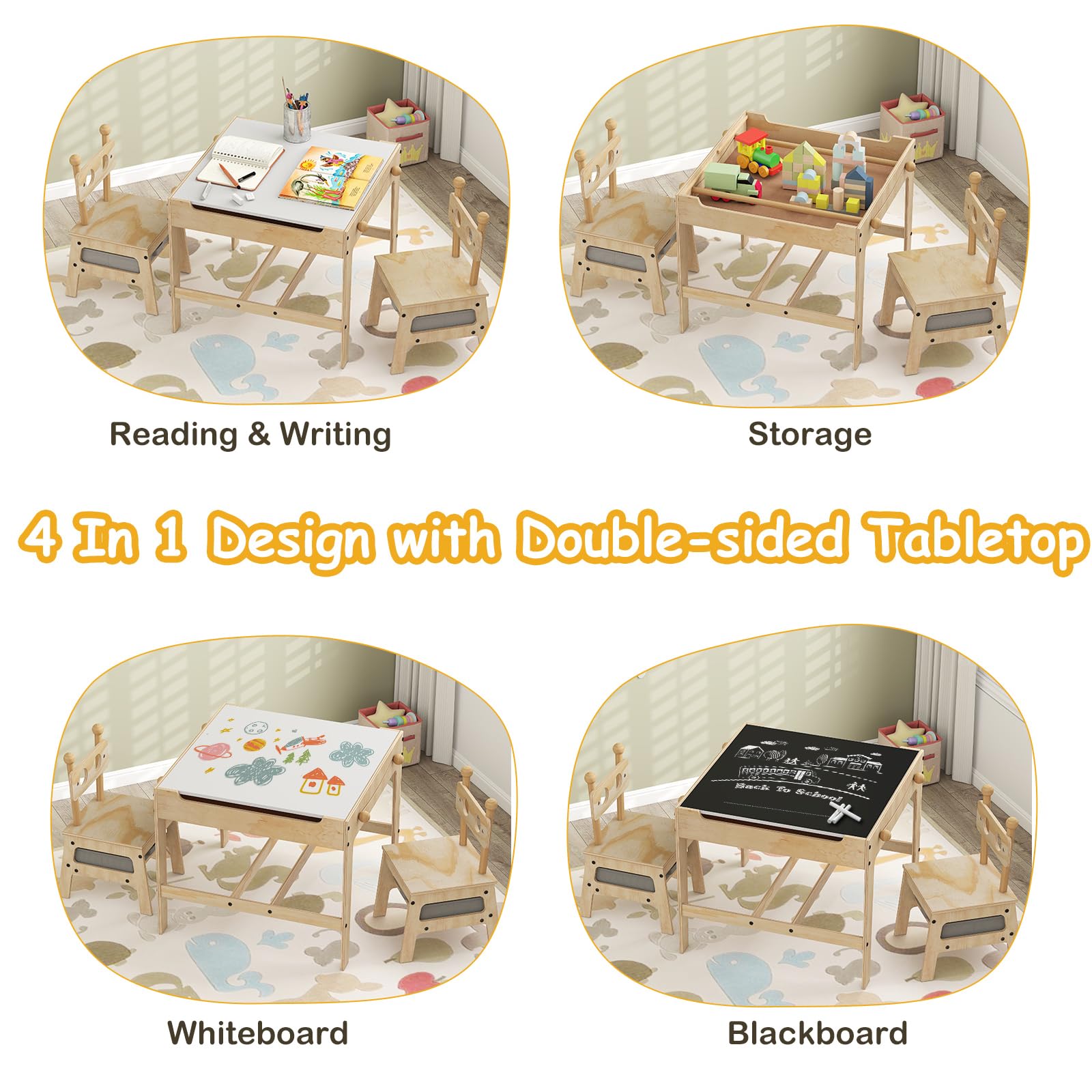 4 in 1 Versatile Activity Table: Featuring a reversible whiteboard (recommended to use chalks to draw on it) and chalkboard, this kids table and chairs set is ideal for arts, crafts, reading, writing, drawing, playing and eating. The thoughtful flip-up groove allows you to easily flap the tabletop or remove it.
