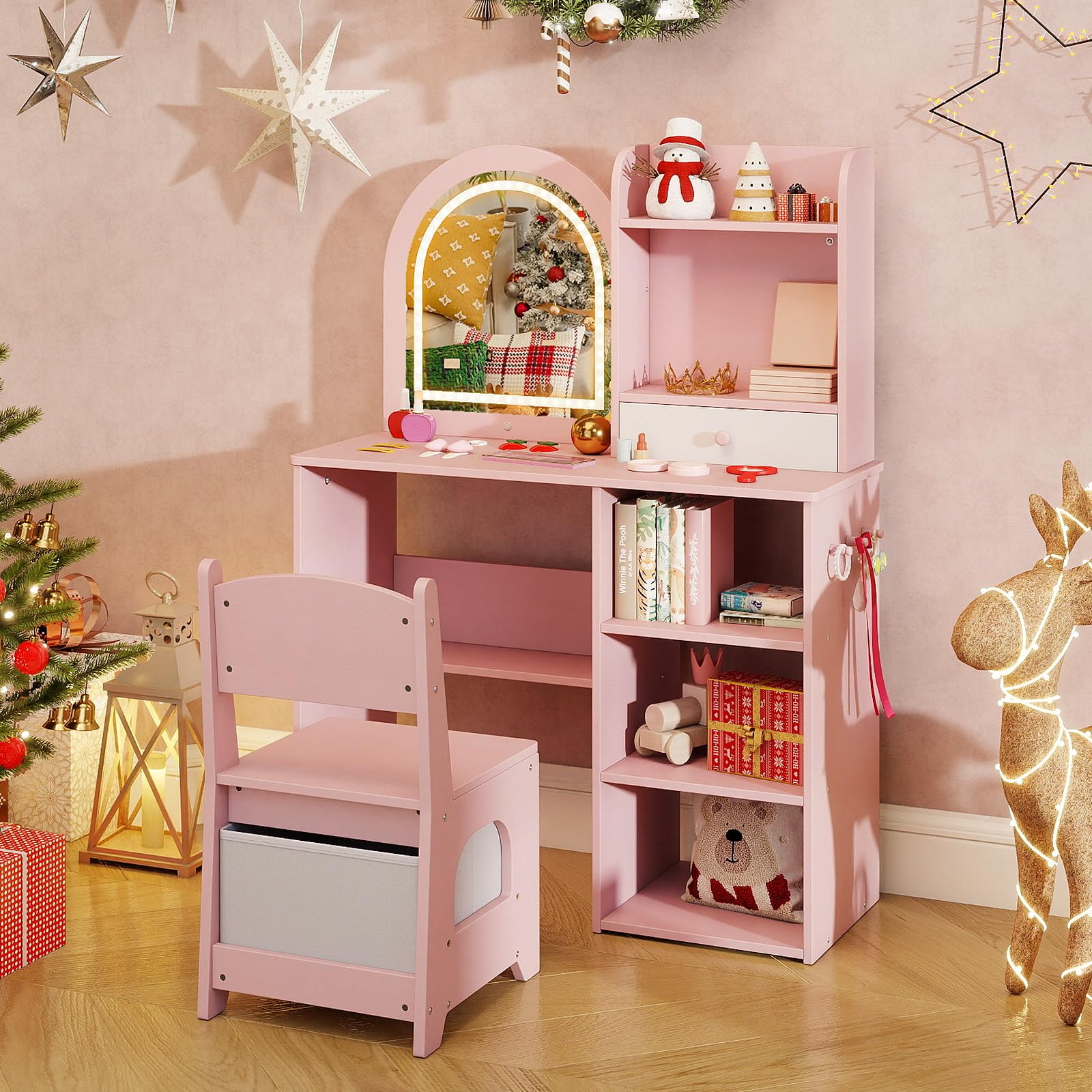 3-color Lighted Mirror: The vanity desk features a lighted mirror with 3 adjustable light colors(white, natural, yellow). Your little princess can press the light switch to easily change the light color to enjoy the perfect lighting for makeup, hair styling, or dress-up play.