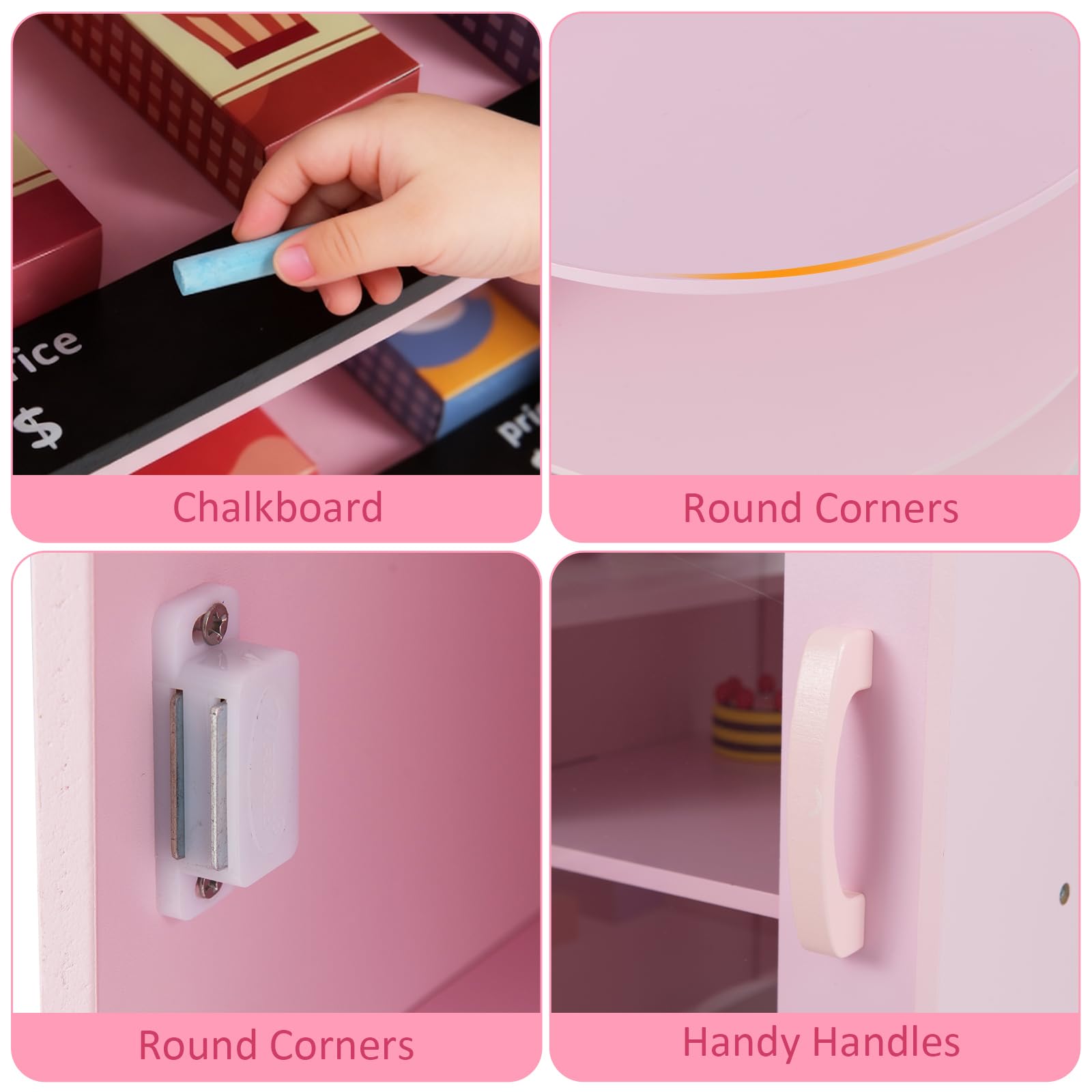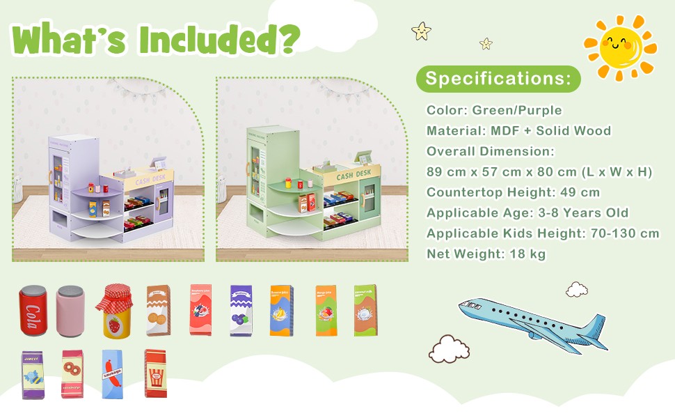 Made of Reliable Materials: Thick boards and solid wood accessories can accompany your little one for a long time. Round corners avoid scratching. Meanwhile, the whole grocery store is safe and reliable.