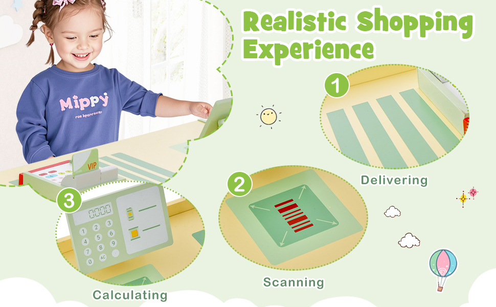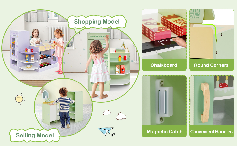 Enjoy Selling and Shopping Fun: Our kids grocery store has a screen, a POS machine, a scanning area and conveyor belt patterns, allowing kids to pretend to checkout. There is a fun vending machine for kids to simulate shopping. Besides, the writable chalkboard helps to add more fun.