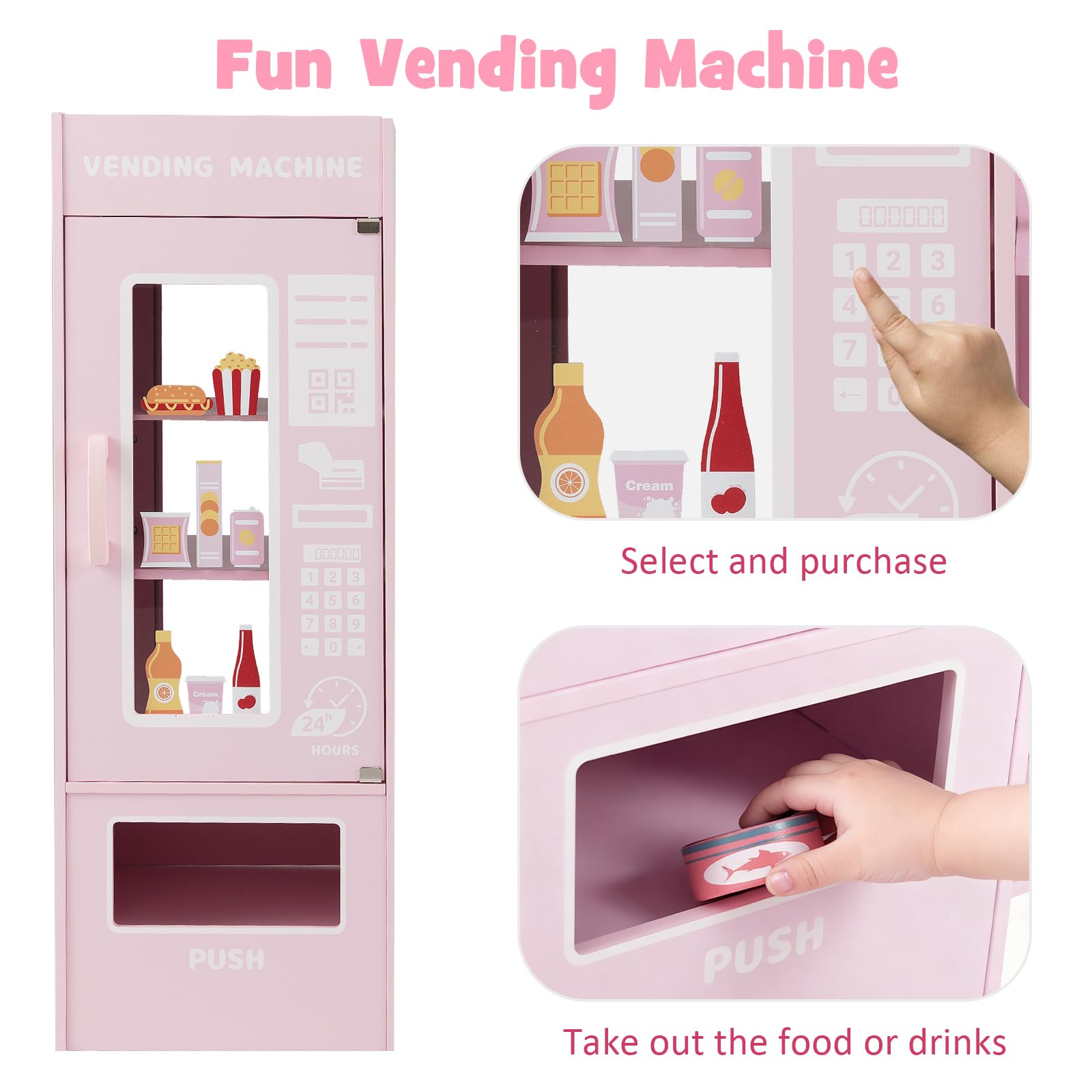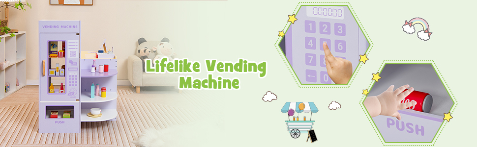 13 Extra Play Food Included: This supermarket play toy set comes with 13 play food, including 2 canned drinks, 1 strawberry jam, 1 banana juice, 1 blueberry juice, 1 raspberry juice, 1 mango juice, 1 coconut juice, 1 biscuit, 1 sweet, 1 doughnut, 1 sausage and 1 french fries. They will offer kids a more realistic experience.
