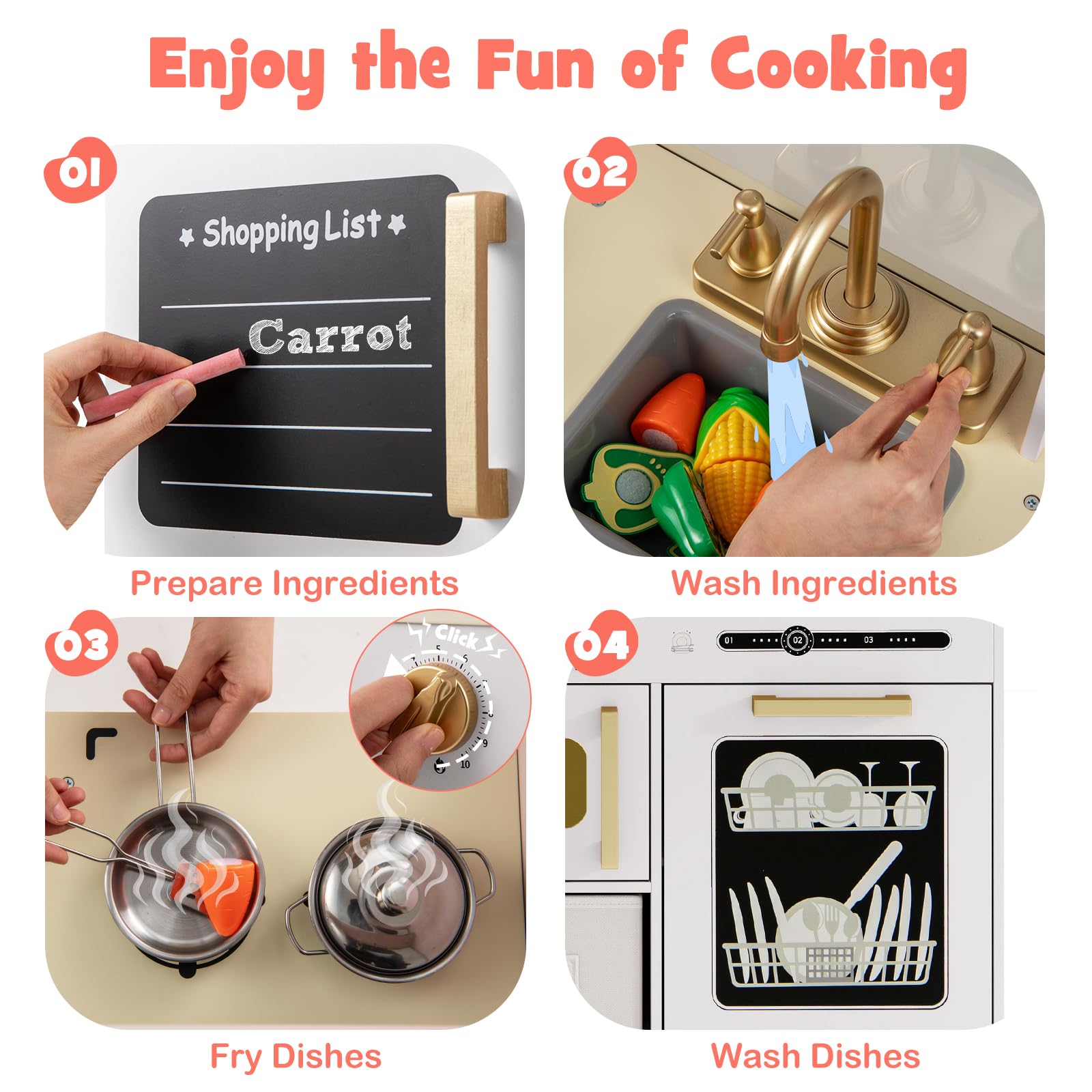 Enjoy the Fun of Cooking: Encouraging imaginative play, this toy kitchen set allows kids to simulate real kitchen activities – prepare ingredients, wash ingredients, fry dishes, and wash dishes. Moreover, the rotary knobs create a satisfying "click" sound, enhancing the experience of cooking and cleaning.