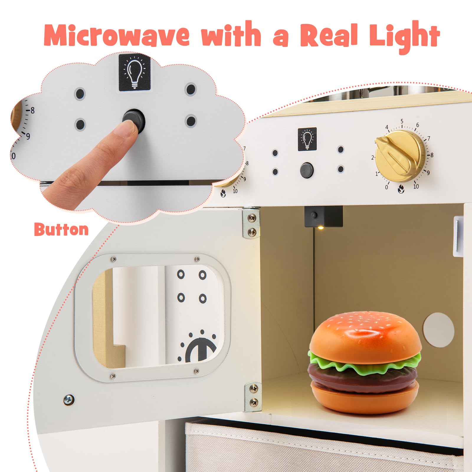 Exciting & Creative Design: The wooden play kitchen boasts a realistic touch with its lighted microwave that lights up at the touch of a button. Meanwhile, the ice maker allows children to put in ice cubes and press to get them. With a DIY chalkboard and acrylic board, little ones can write and draw to express themselves.