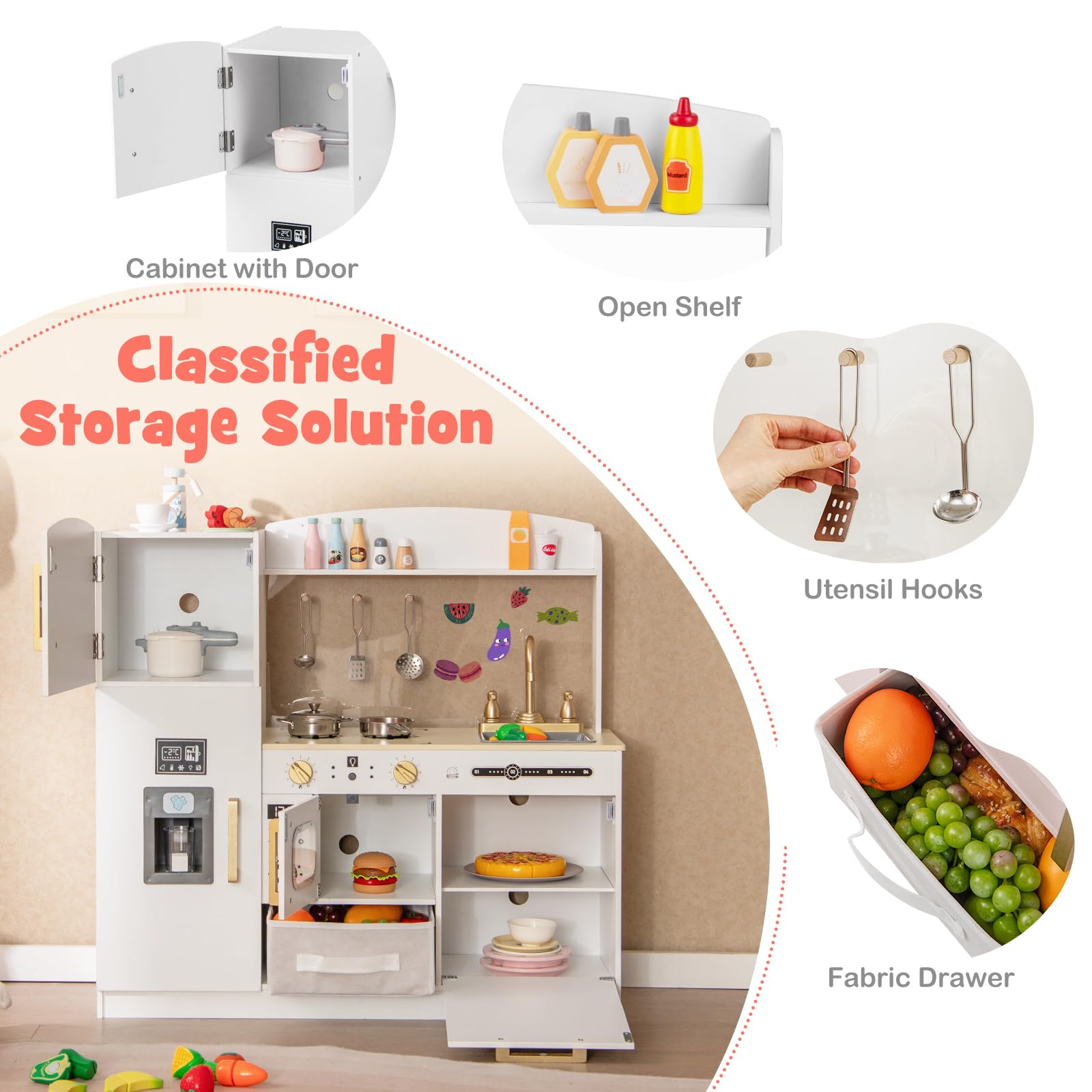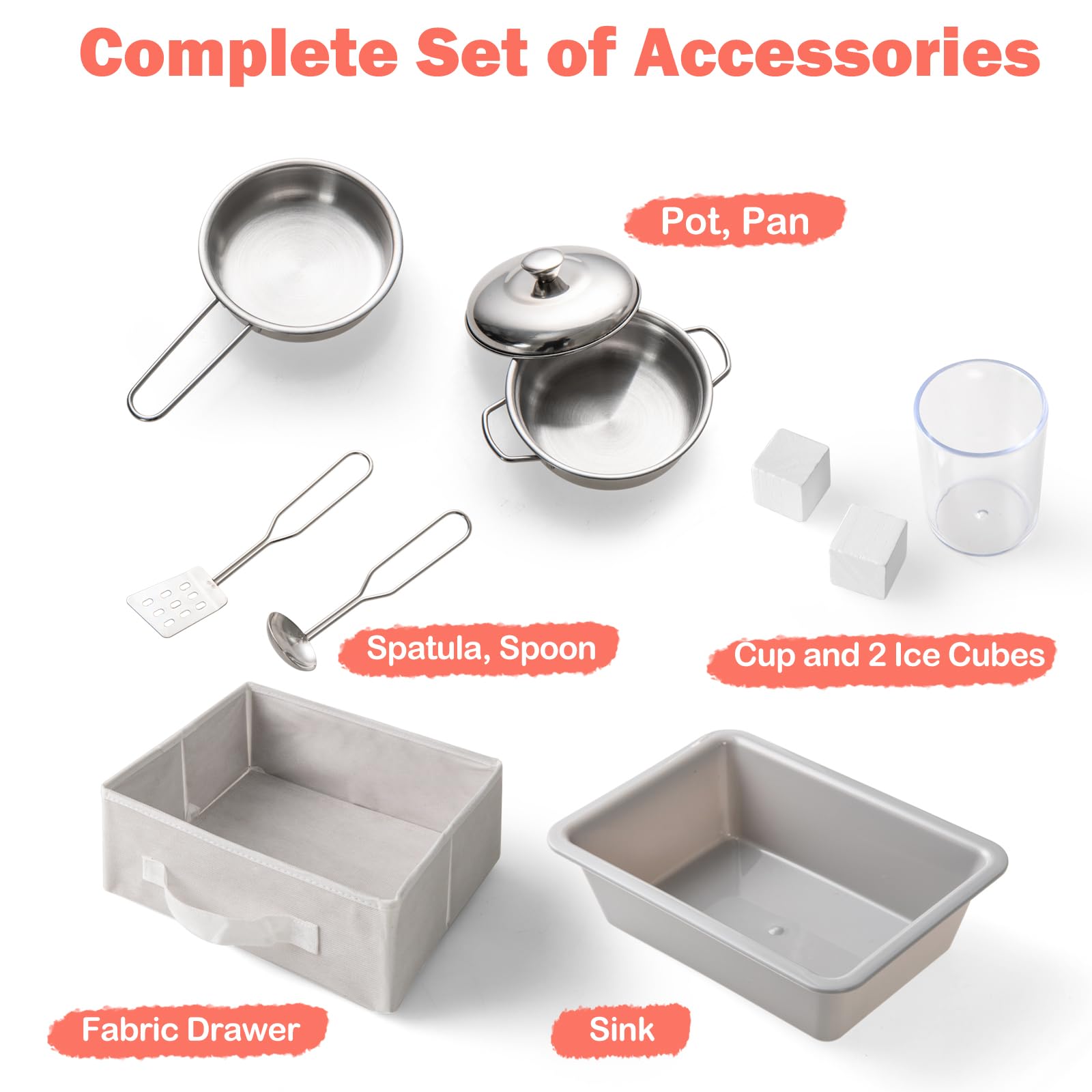Ample Accessories & Storage: Including a cabinet with door, open shelf, fabric drawer and 3 utensil hooks, this toddler kitchen playset offers ample storage for toys and other items. The kitchen comes with accessories like a pot, pan, spatula, spoon, cup and 2 ice cubes, providing a complete play experience.