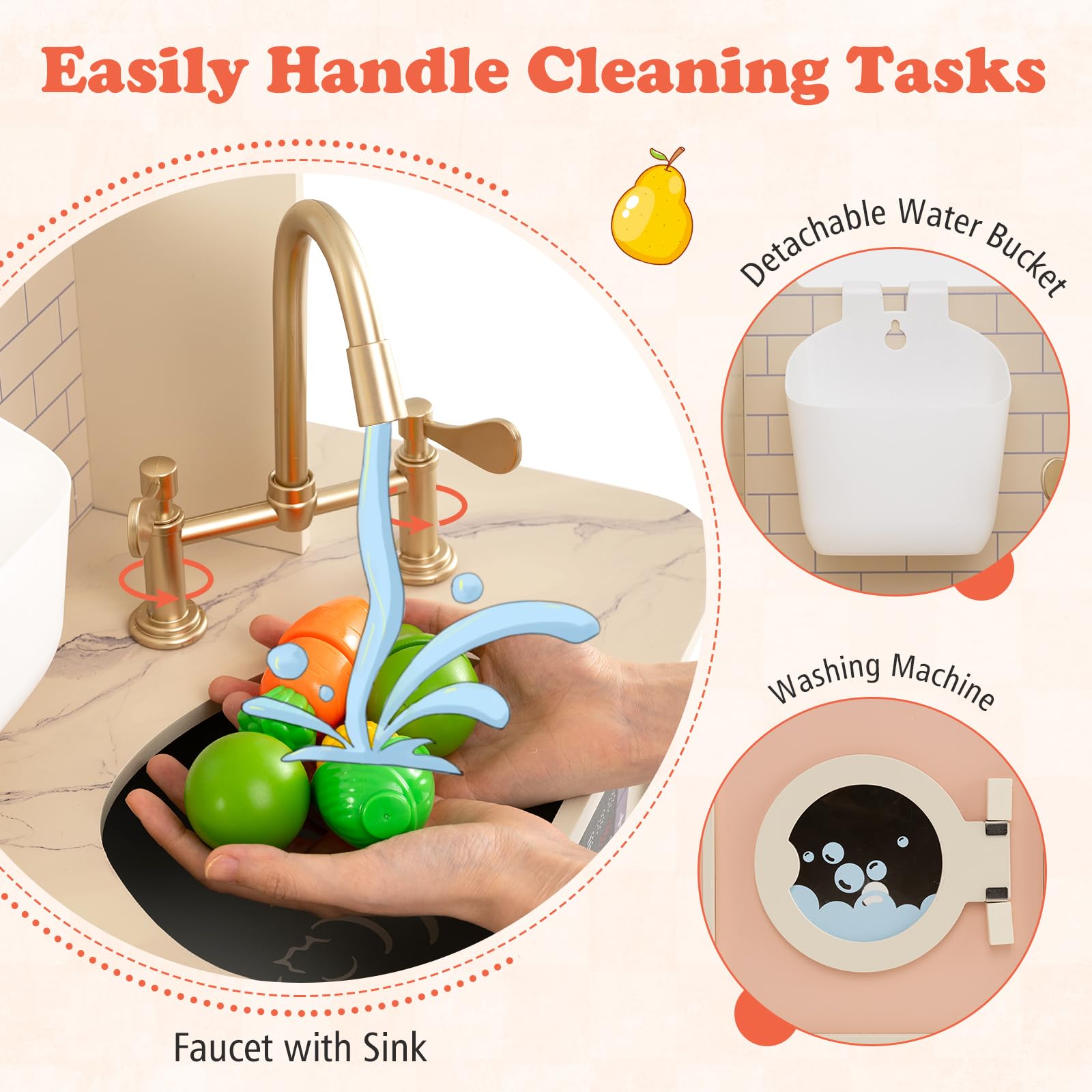 Ignite your child’s imagination with this vibrant kids cooking playset, featuring 25 delightful accessories. It boasts 2 stoves with lights and sounds, rotation knobs that click, washing machine, microwave oven, coffee machine, toaster, and ice dispenser. Also, it has an integrated oven to fulfill children’s little baking dreams. More, little ones will love the interactive cleaning area, complete with a faucet, sink, and removable water bucket. Thoughtfully designed storage - including a 2-tier dessert stand, top shelf, hanging hooks, and a side cabinet - helps teach tidiness and responsibility. Ideal for kids aged 3 and up, it offers a fully immersive cooking and cleaning role-play adventure.