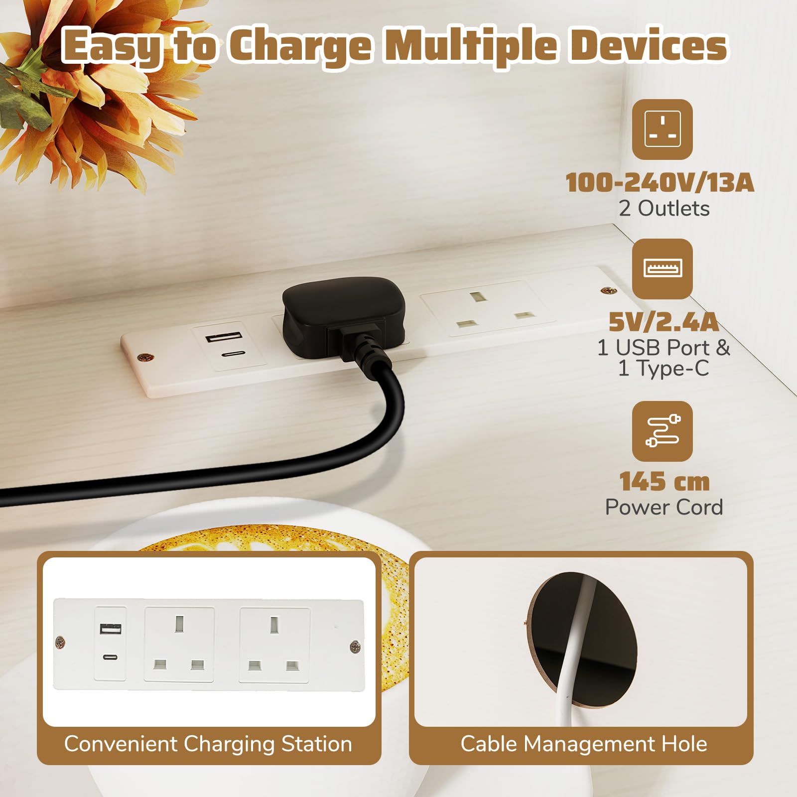 - 2 Outlets: 100-240V/13A