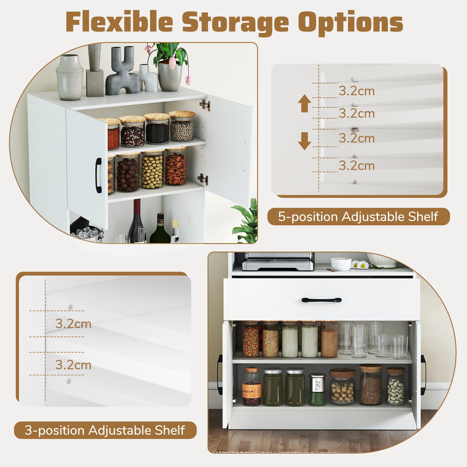 Flexible Storage Options: The top cabinet comes with a 5-position adjustable shelf, allowing you to customize the spacing to suit items of varying sizes. Plus, the bottom cabinet includes a 3-position adjustable shelf to enhance flexibility, perfect for small or large kitchen supplies.