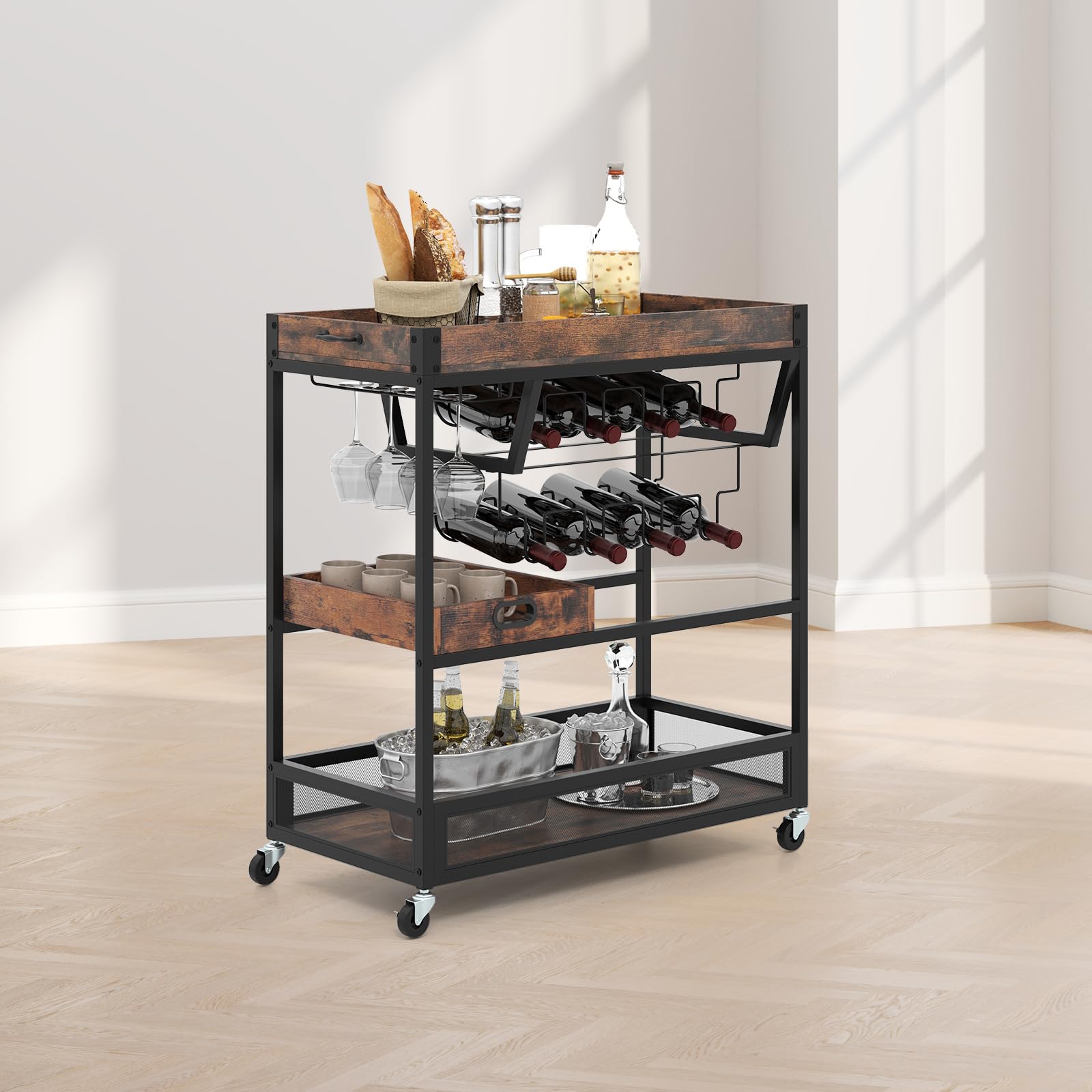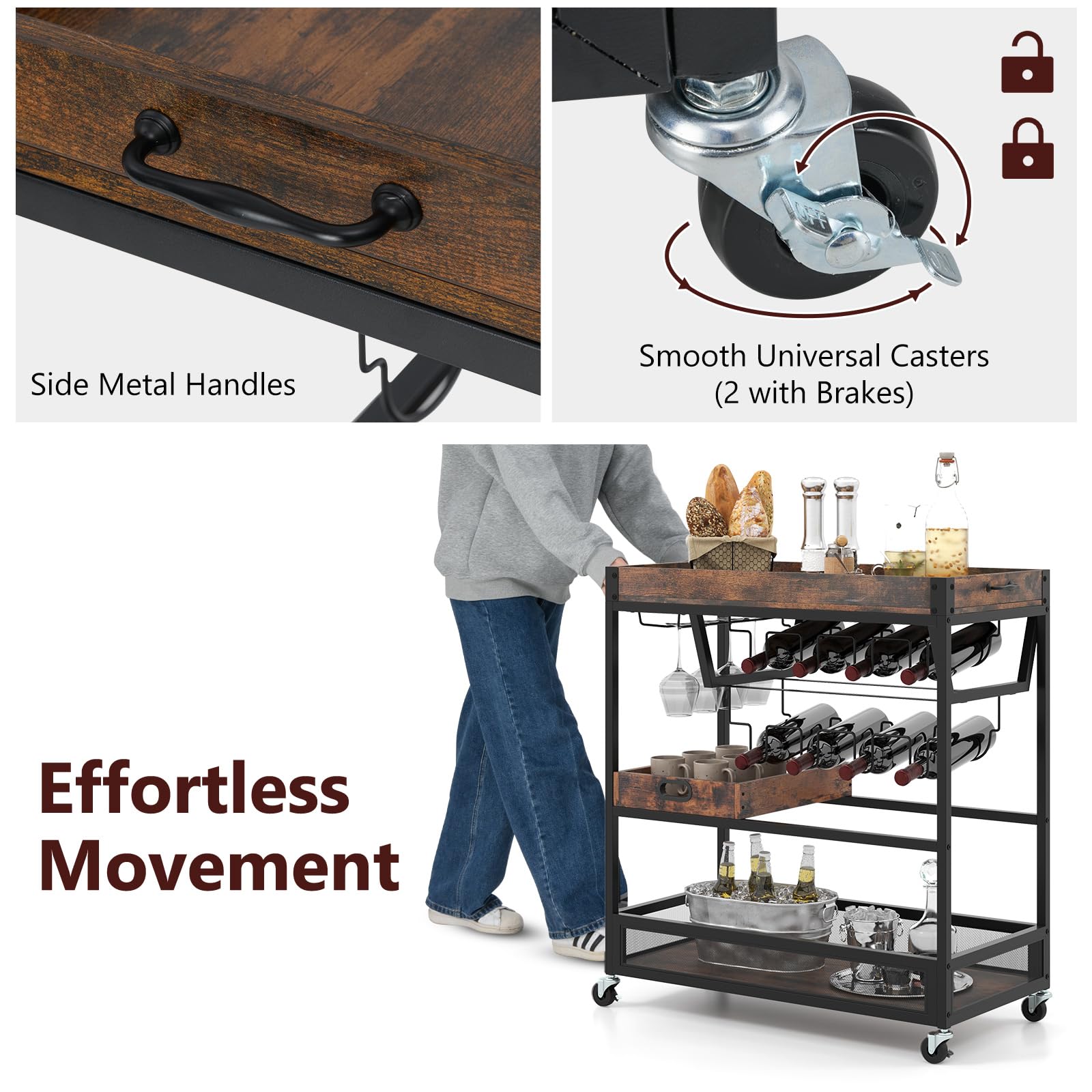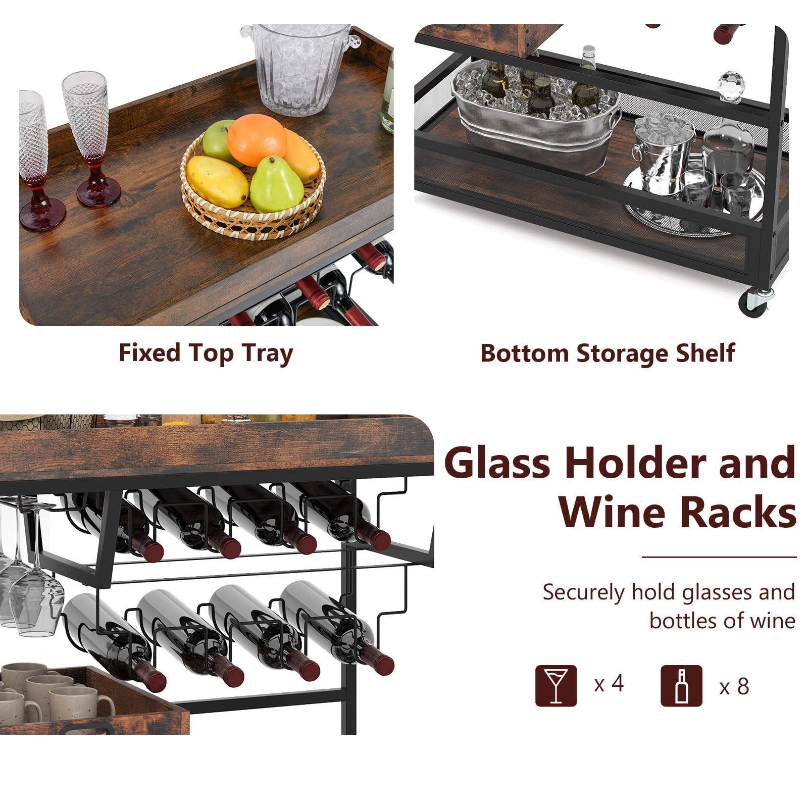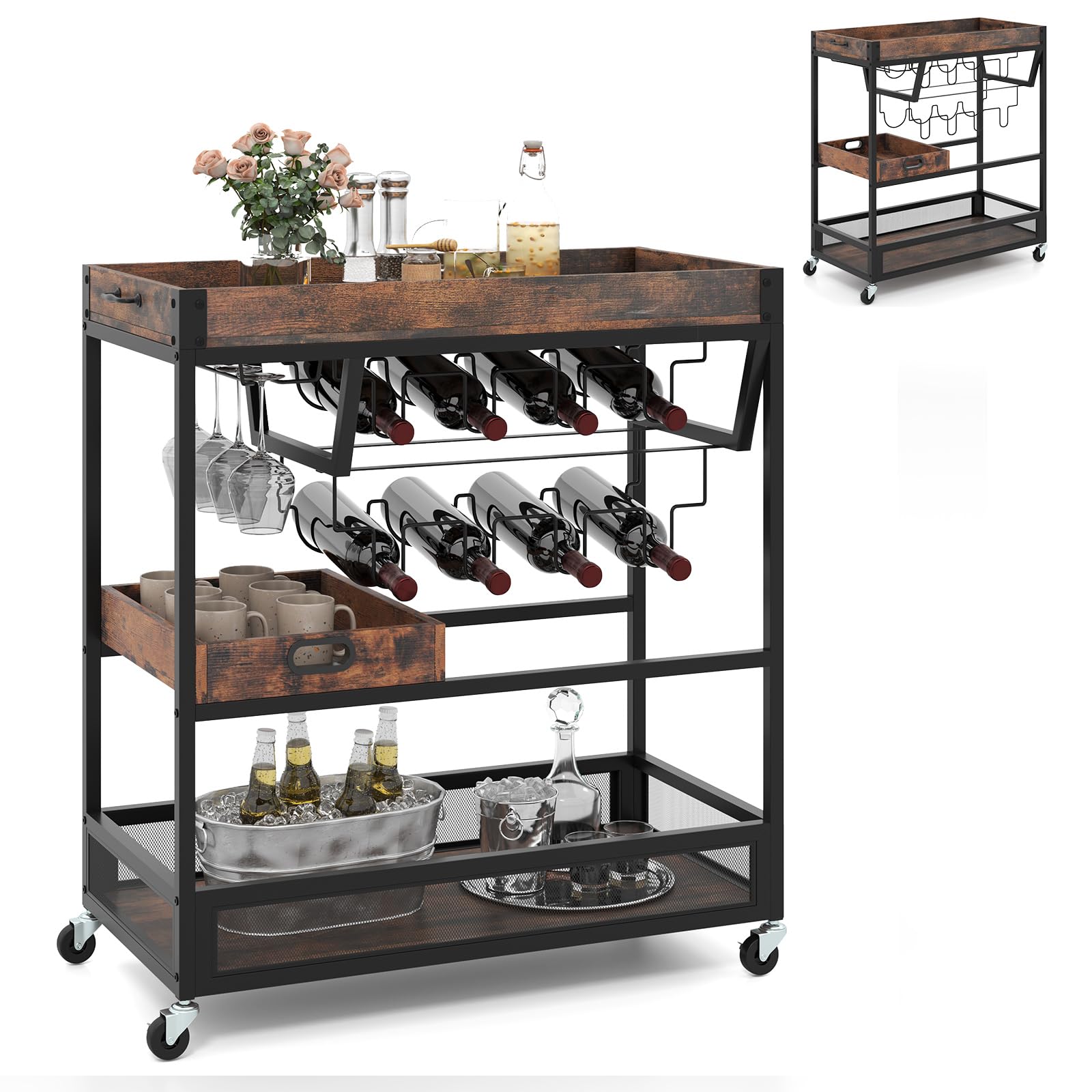 Great for Wine Storage: The 3-tier bar cart features 2-tier wine rack to hold 8 wine bottles and 1 row of stemware holder for 4 glasses or mugs. Additionally, the countertop and bottom storage shelf provide more storage space for food, snacks, or bar essentials.