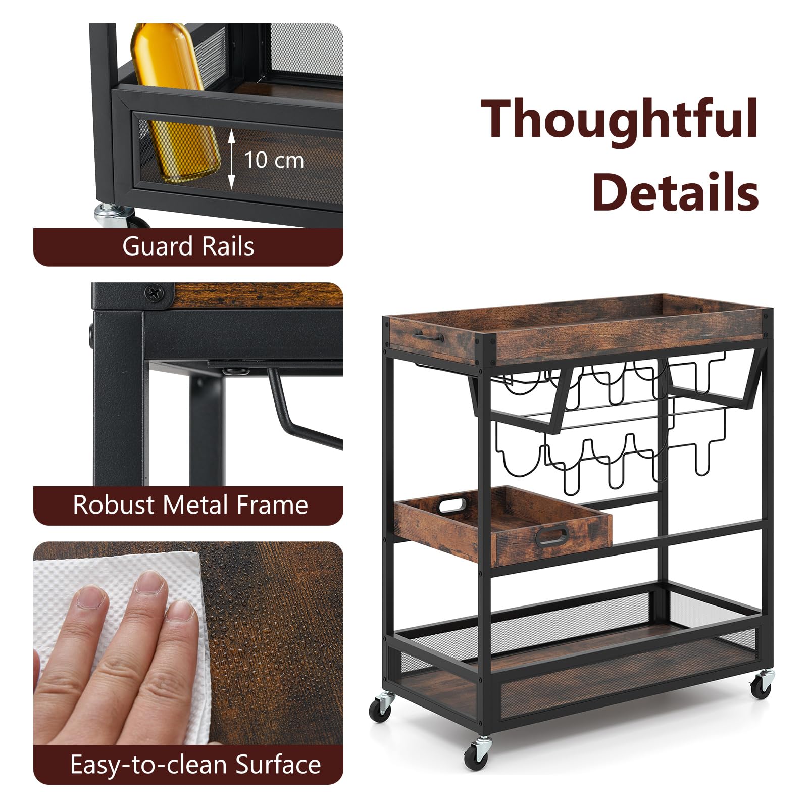 The bar cart has 1 countertop, 2-tier wine rack, 1 row of glass holder, 1 tray, and 1 bottom shelf to store wines, glasses, dishes, fruits, and more. You can detach the tray and hold it with handles to serve guests. The protective guardrails of the bottom shelf will protect items from falling down. Furthermore, 4 rolling wheels make it easy to move. 2 wheels are lockable. The solid metal frame and thick panels keep the bar cart strong and sturdy.