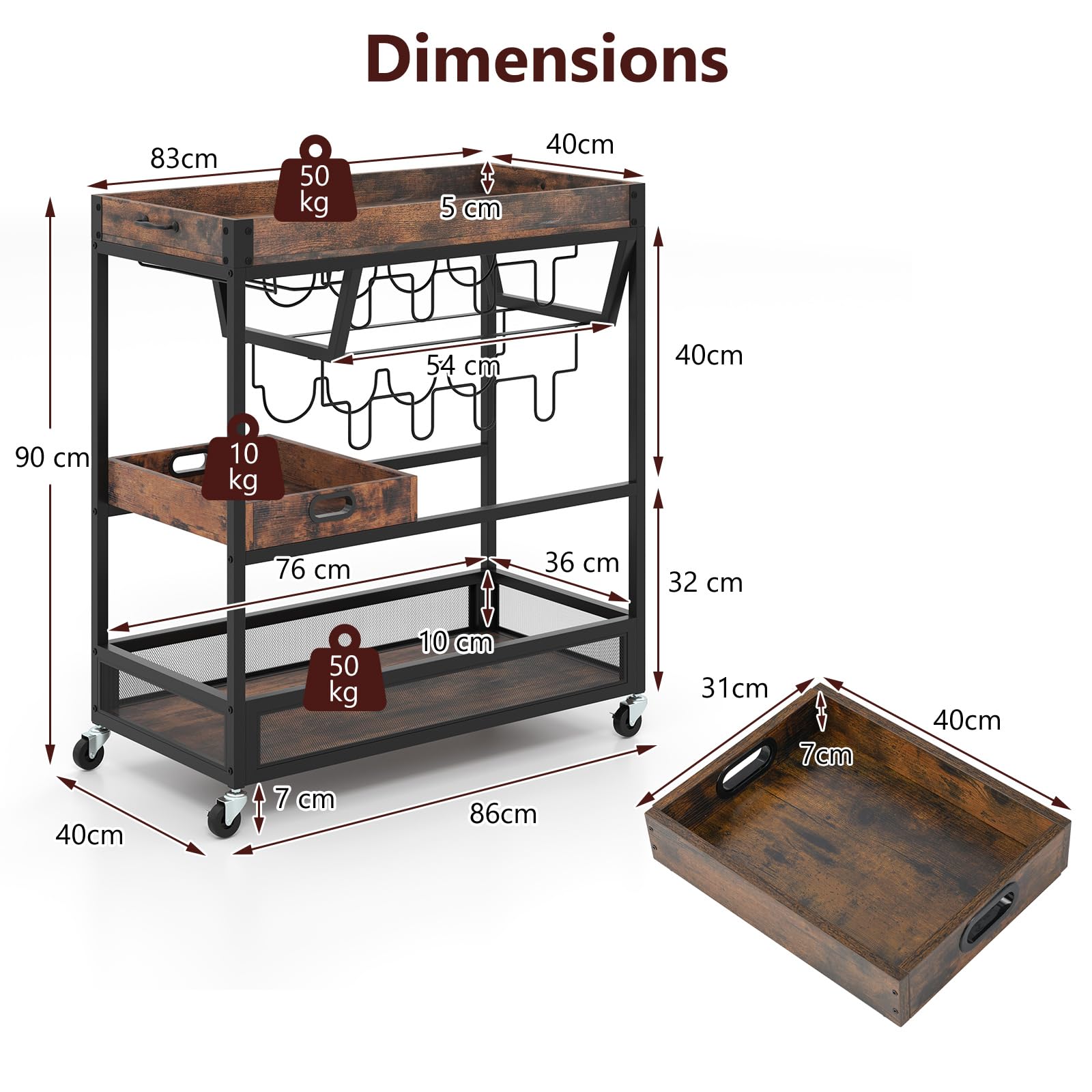 Long-lasting and Stable Support: Crafted with metal pipes and thick panels, the bar cart ensures sturdy support and a long-lasting lifespan. The fixed top tray/bottom shelf bears a weight up to 50 kg, while the removable tray holds up to 10 kg.