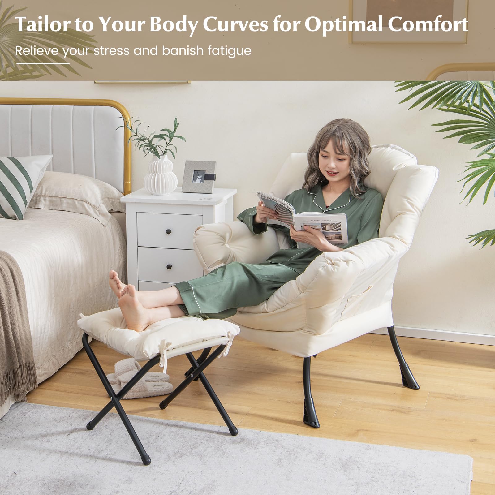Selected Quality Materials: The high-quality polyester fabric is comfortable, soft, breathable and elastic. Filled with soft doll cotton, the accent contemporary lounge chair and cushion provide a cozy touch. What's more, the selected materials make this lazy chair with ottoman complements various occasions, such as living room, bedroom, courtyard, garden and more.