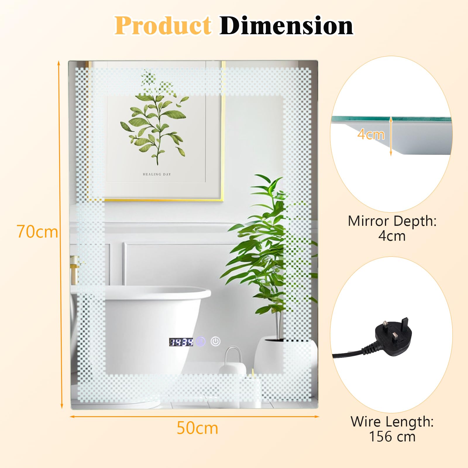 With just a single touch, this mirror effortlessly clears up a large defogging area, ensuring a clear reflection in a short amount of time. In addition to its defogging capabilities, this mirror offers three LED light choices, allowing you to personalize the lighting to suit your needs. With a simple press, you can easily switch between three color temperatures: warm light, natural light, and white light. Never worry about forgetting your preferred lighting settings again! This mirror features a smart memory function that retains your chosen lighting mode. This means that each time you use the mirror, it will automatically adjust to your desired settings, saving you time and effort. Furthermore, experience hassle-free installation with the easy-to-install bathroom mirror. This mirror comes with expansion screws that simplify the installation process. Rest assured knowing that the HD mirror is built with premium quality materials and designed to provide a safe and high-definition reflection. Every detail will be crystal clear, enabling you to see yourself with absolute clarity. Plus, for added safety, the mirror is equipped with an explosion-proof film, providing an extra layer of security during use. Upgrade your bathroom today and elevate your daily routine with this exceptional mirror. If you are looking for an anti-fog lighted mirror like this, do not hesitate to place an order!