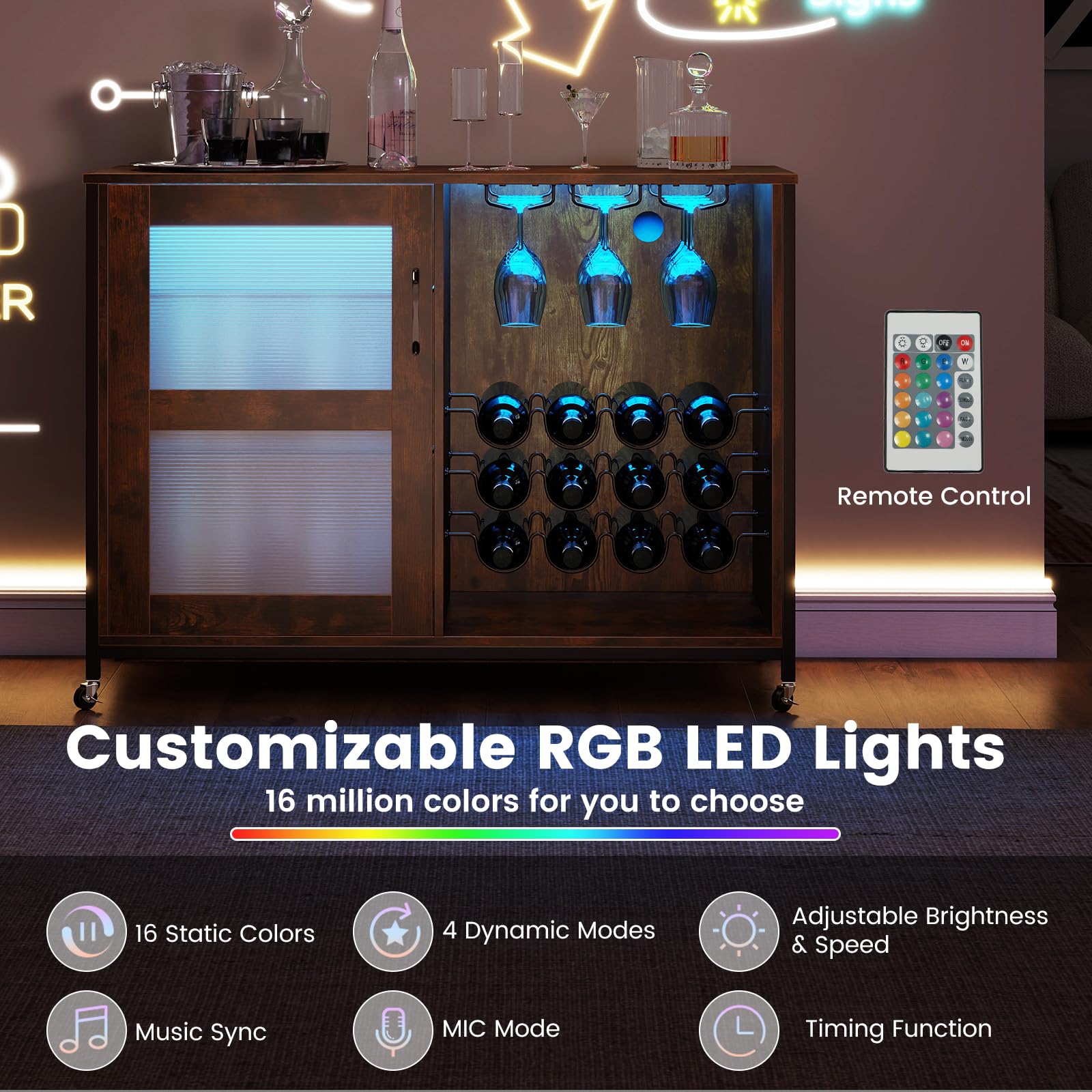 Customizable RGB LED Lights: Our wine bar cabinet is equipped with customizable RGB LED lights featuring 16 million colors, 16 static, 4 dynamic modes, adjustable brightness and speed, all controlled via remote or app. You can also enjoy music sync and MIC mode for memorable parties.