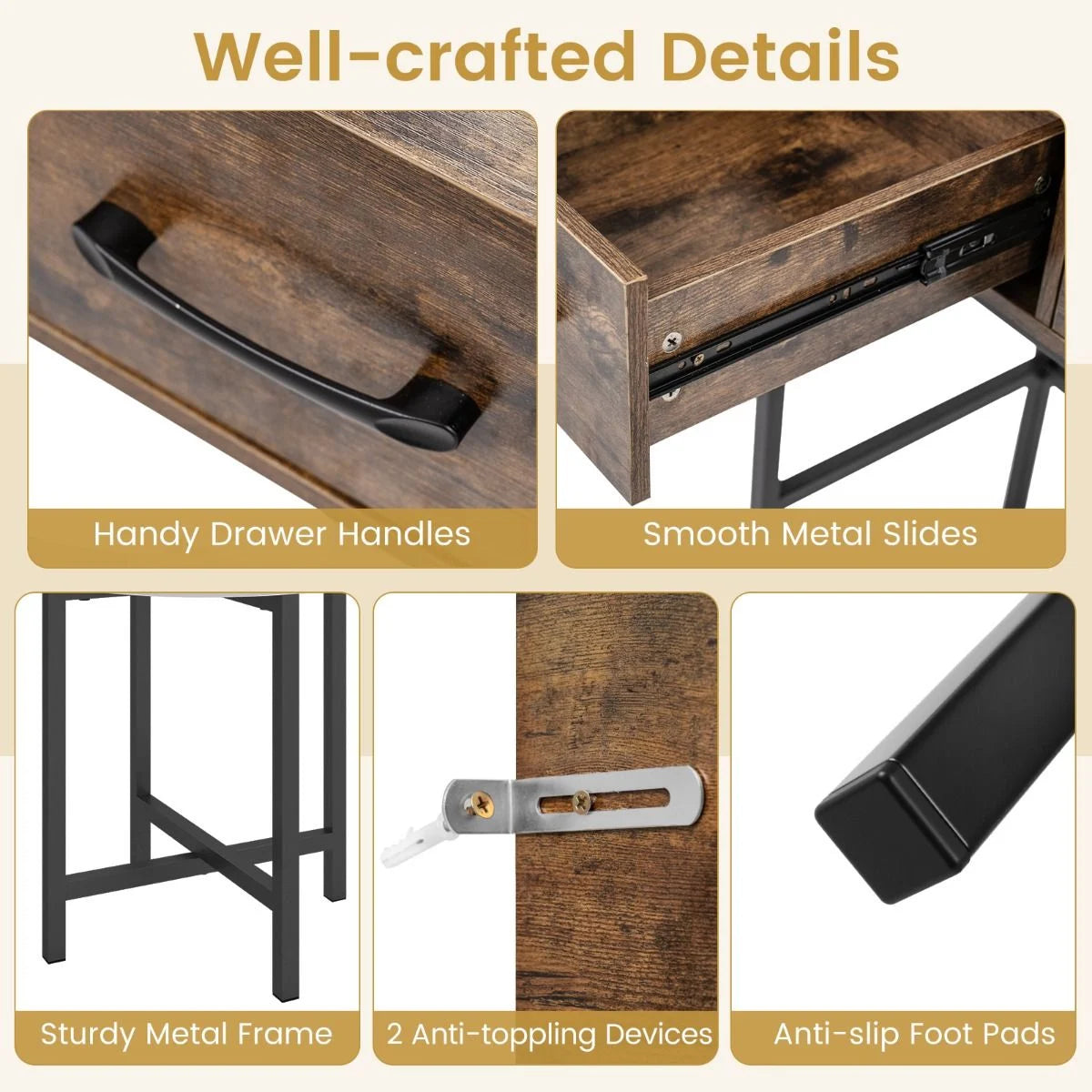 Stable & Safe Construction: The sturdy metal frame ensures long-lasting stability and durability, complemented by anti-slip foot pads for safety on different floor surfaces. In addition, this dressing table includes 2 anti-toppling devices for extra security.