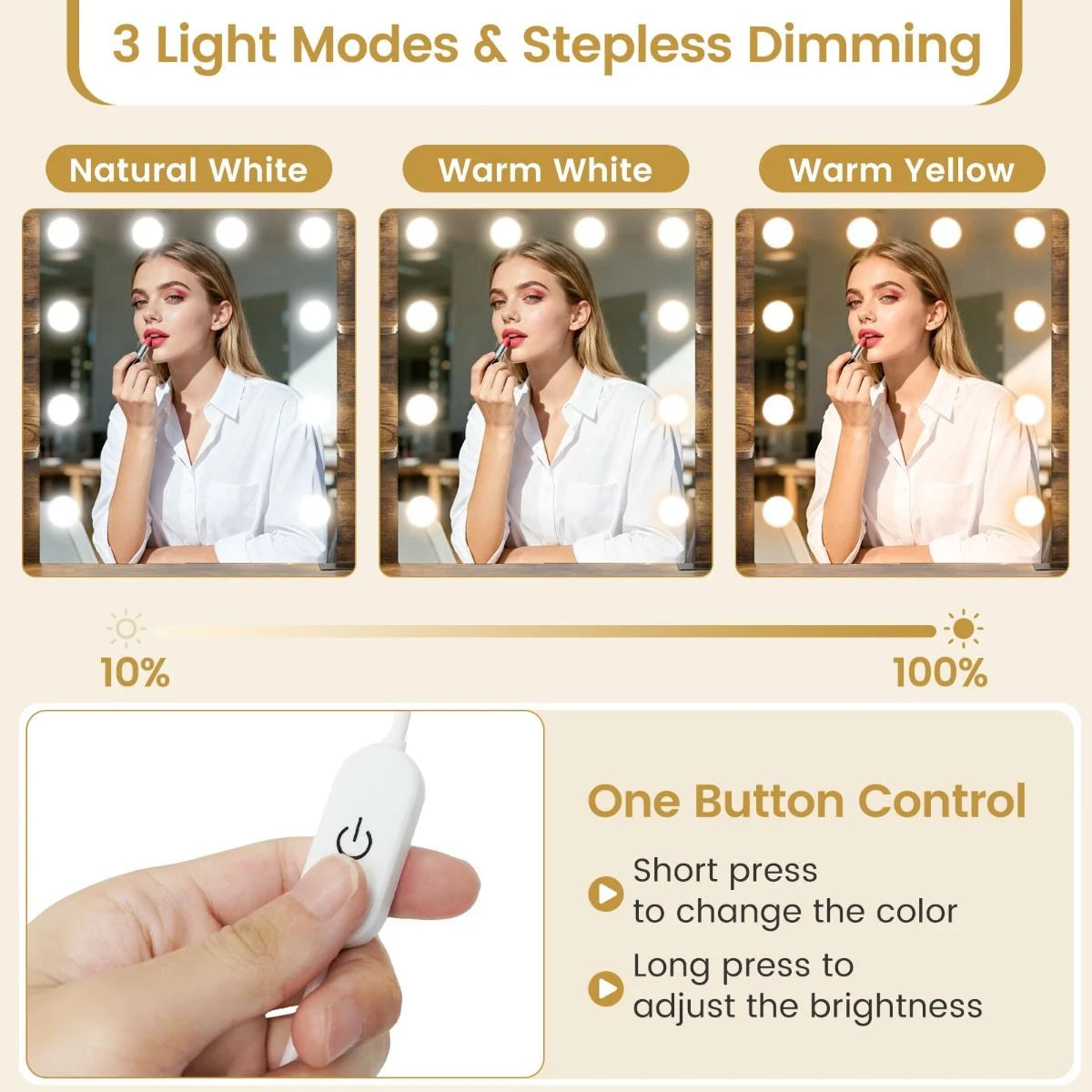 3 Light Modes & Stepless Dimming: This vanity desk comes with a lighted mirror, which offers 3 color modes (natural white, warm white, and warm yellow) with adjustable brightness to achieve flawless makeup application anytime.