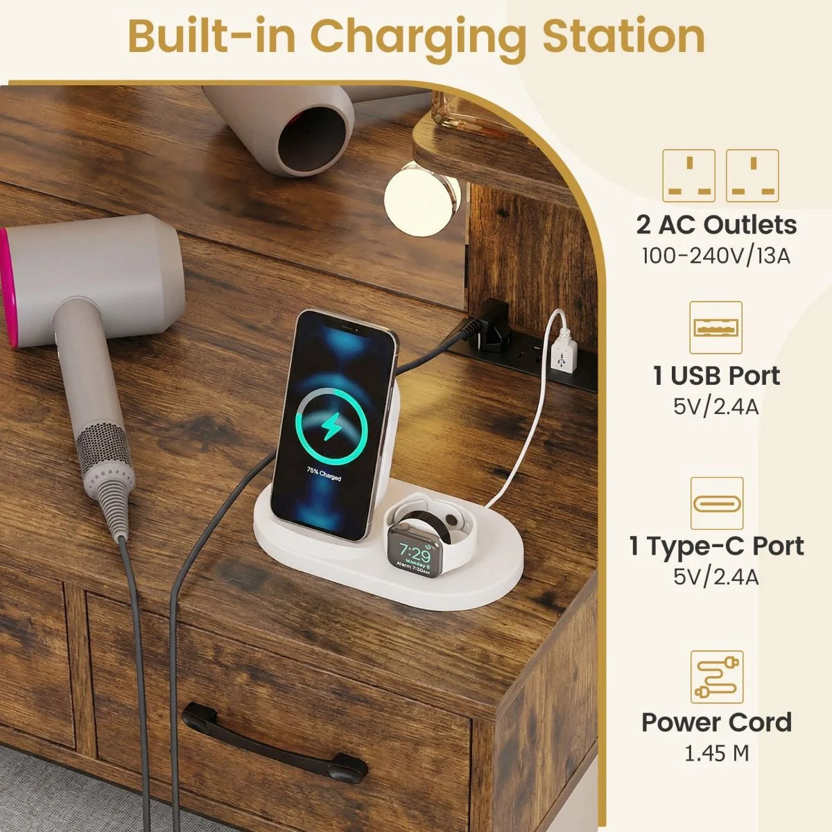 Built-in Charging Station: This makeup table set with built-in power outlets offers ultimate convenience with 2 x 240V/13A AC outlets, 1 x 5V/2.4A USB port, and 1 x 5V/2.4A Type-C port, allowing you to charge all your devices while getting ready.