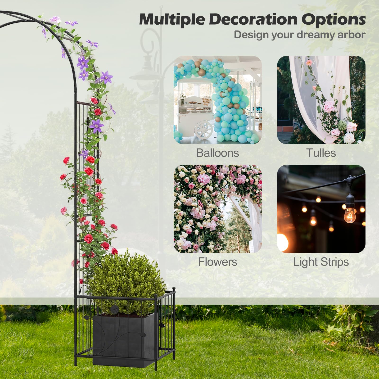 Customizable Trellis Design: The archway trellis will unleash your creativity, which serves as a blank canvas for your imagination. For example, you can decorate it with decorative lights, flowers, or colorful balloons to add a unique touch to your outdoor space.