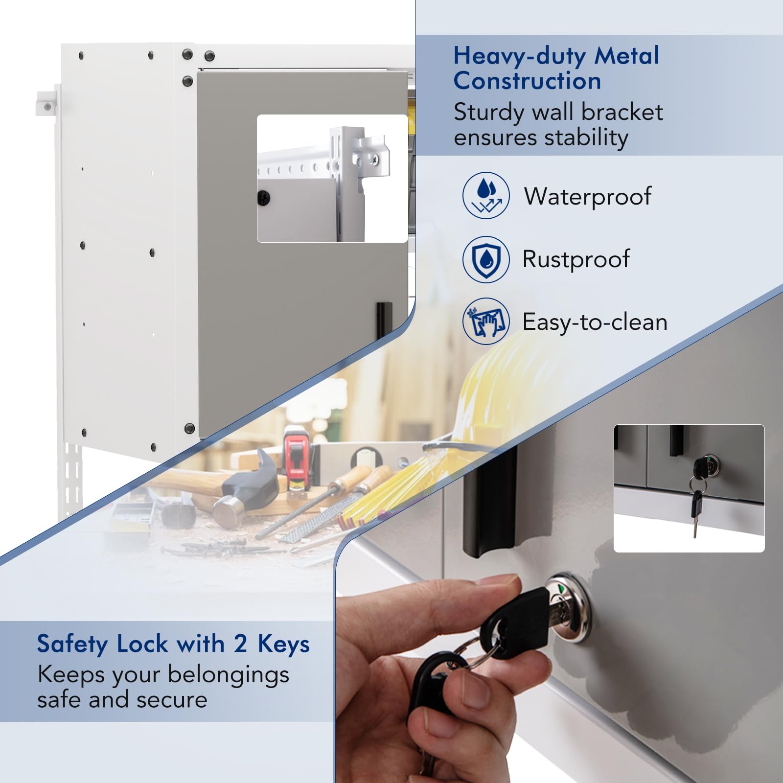 Secure Storage Solution: The lockable storage cabinet with 2 doors can keep your prized possessions safe and sound. With its lock and 2 keys, you can rest easy knowing your items are secure.