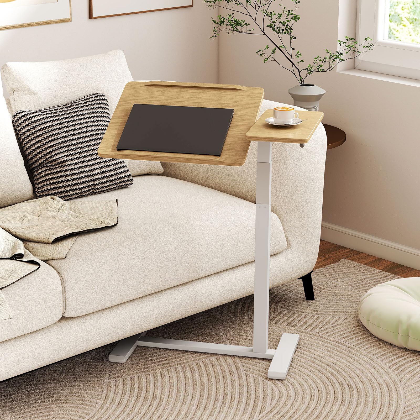 This multifunctional laptop desk is designed for adaptability and convenience, featuring an easily adjustable height ranging from 70 cm to 103.5 cm with a smooth gas lifting mechanism. Its split top offers a tilting section for optimal viewing angles, equipped with edge stoppers to keep items secure. Perfect for small spaces, its C-shaped design and hidden 360° wheels allow it to glide effortlessly under furniture. The sturdy H-shaped metal base and rounded corners enhance safety and stability. Whether next to your bed, couch, or recliner, this mobile standing desk serves as a versatile workstation to enhance your home environment with style and functionality.
