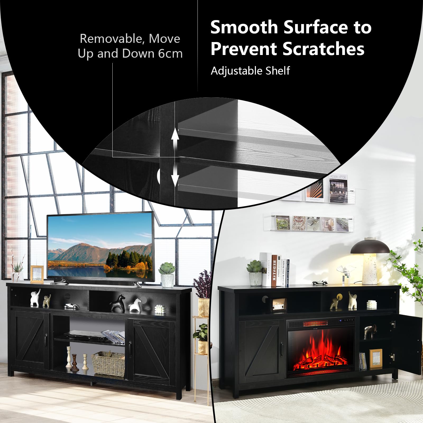 Adjustable Middle Shelf: The middle shelf can be adjusted up and down 6cm to accommodate items of different heights. Besides, you can remove it to place a 25’’ electric fireplace(excluded), which allows you to spend a cozy leisure time with family and friends even in cold weather.