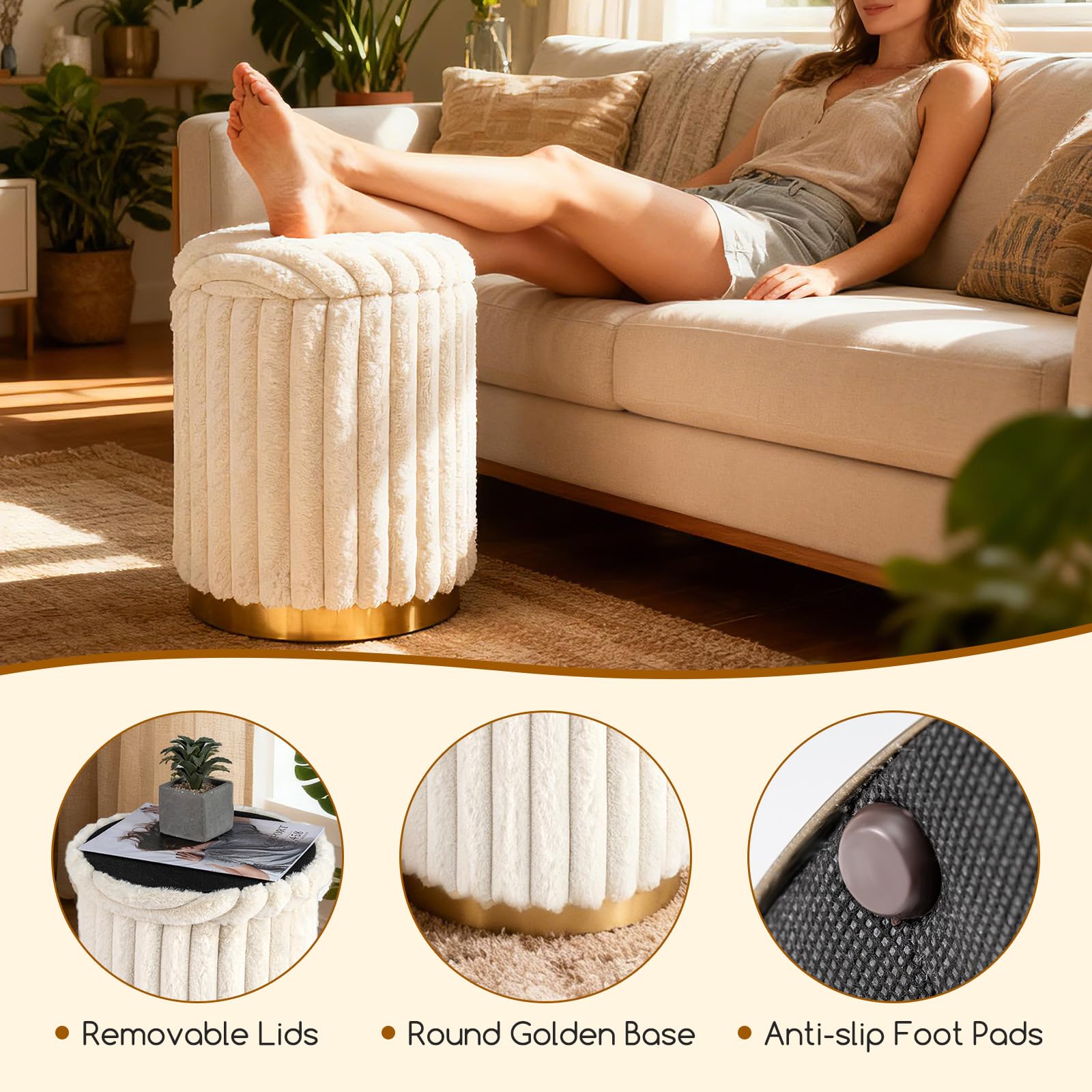 3-in-1 Multifunctional Design: More than footstools, the ottomans also serve well as storage boxes to hold your sundries or side tables to place your coffee or tea. The removable lid can be turned upside down to be used as a small tabletop.