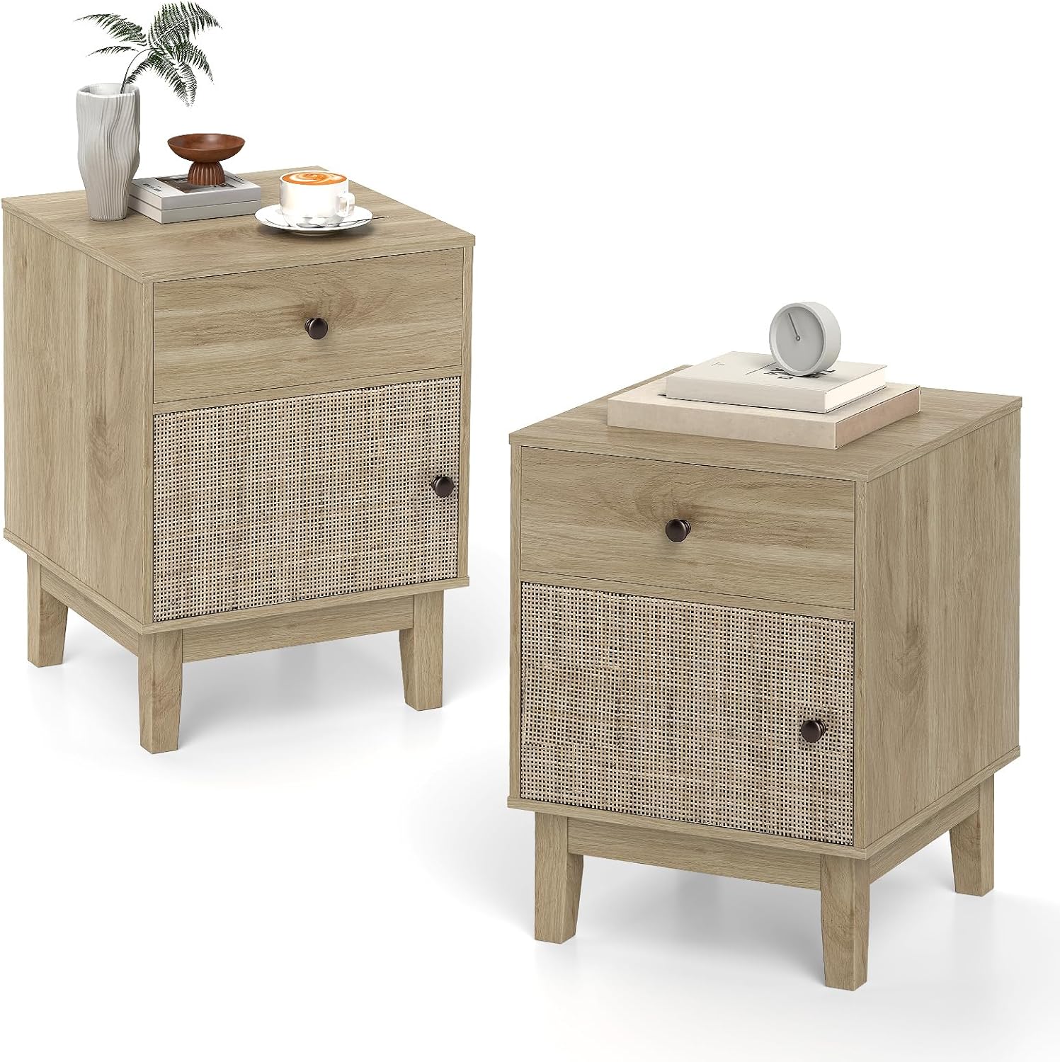 This exquisite rattan nightstand isn’t just a piece of furniture, it’s a statement of style marrying mid-century charm with a chic boho flair! Maximize your space and keep clutter at bay with its ample storage, including a smooth-gliding drawer and a spacious cabinet. Built to last on solid wood legs, and equipped with non-slip pads, it promises both stability and durability. Plus, sleep soundly knowing it features a safety-first anti-tipping design. Experience everyday ease with its premium build, enhancing your bedroom not just visually but functionally. Elevate your bedside elegance today!