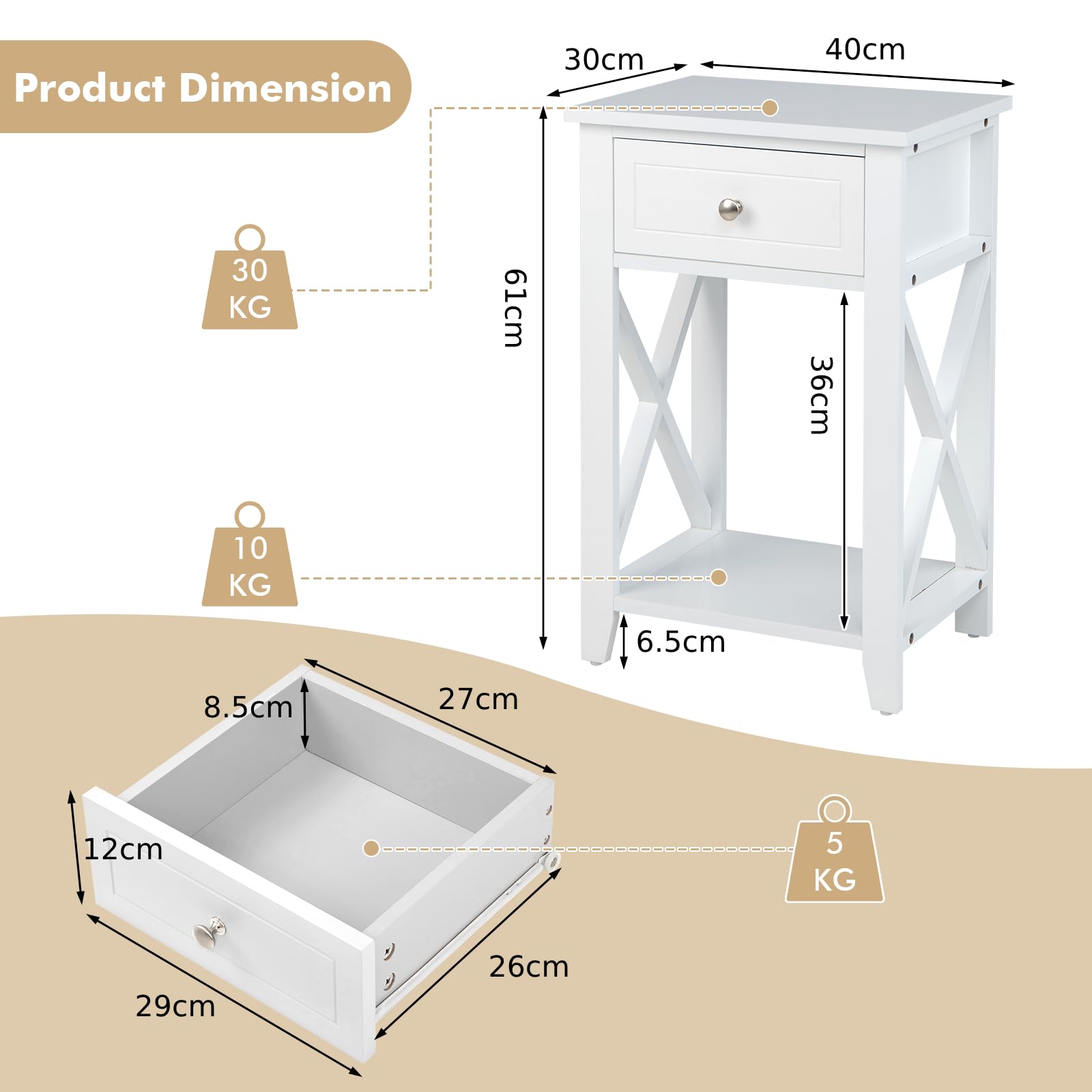 This compact bedside table is multifunctional so that you can place it next to your bed, sofa, recliner, etc. The spacious tabletop and bottom open shelf provide roomy space for storing and displaying. Besides, the pull-out drawer with a handle and smooth slides offers ample room for storing some private or important stuff. With this nightstand, your essentials can be kept close by, such as a table lamp, storage boxes, books, chargers, cups, photos and more. As for the quality, made of premium MDF with paint, this end table can serve you for a long time and is easy to clean. In addition, the X-shaped structure and bottom anti-slip foot pads enhance overall stability. Featuring a modern simple design, our side table will be a perfect addition to your home. If you are looking for a 2-tier nightstand like this, do not hesitate to place an order!