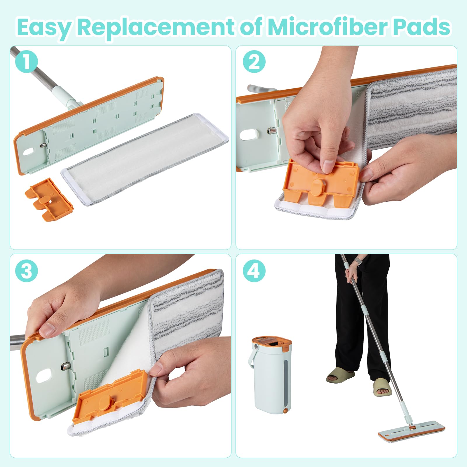 Enduring Microfiber Pads: The 2 included microfiber pads are machine-washable, quick-drying, and offer strong water absorption. This allows the flat floor mop and bucket to effortlessly remove stains while protecting your floors from damage.