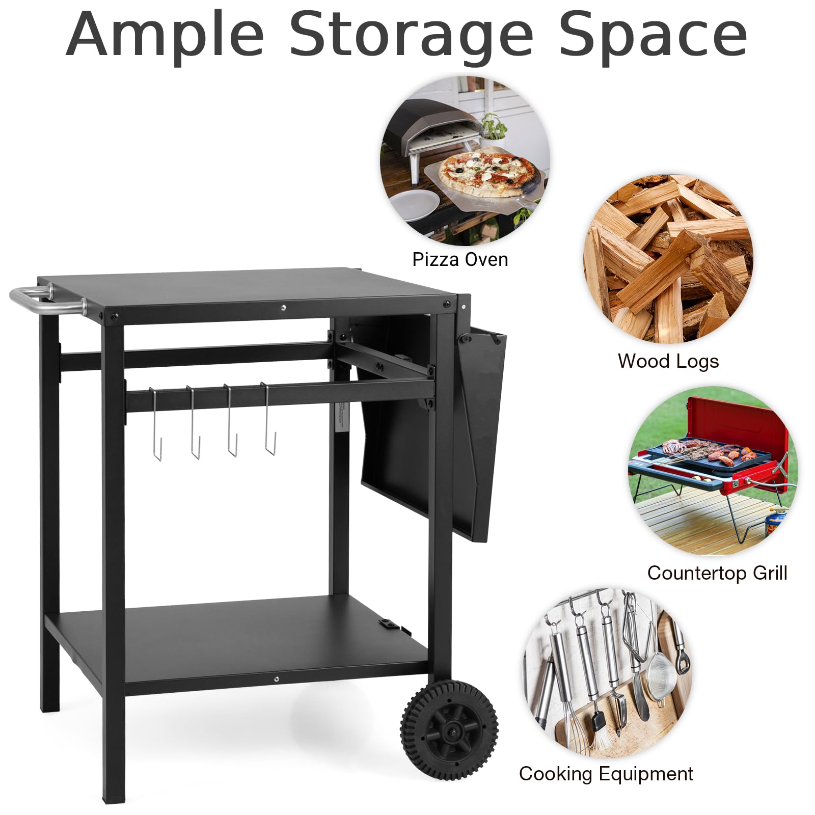 Double Shelves and Extra Hooks: With a double-shelf design, the outdoor prep cart offers enough storage space for your pizza oven, wood logs, grills or cooking equipment. An open shelf ensures convenient access to what you need. There are 4 removable hooks and 1 fixed hook to hang kitchen accessories, tools or propane gas tank.