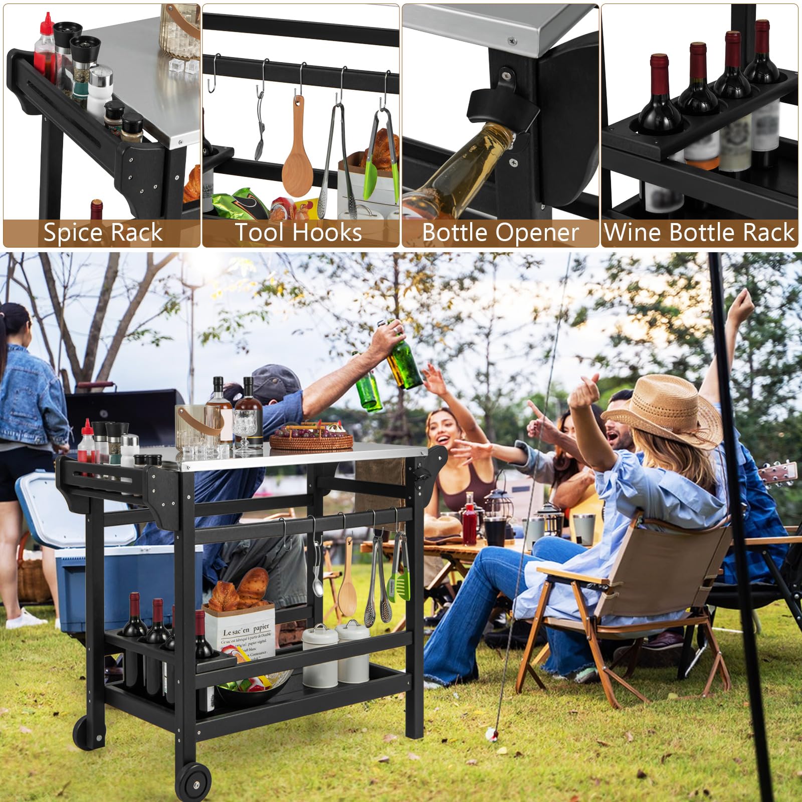 Designed for Outdoors: Made of high quality HDPE, the movable dining cart table is able to withstand sun, rain and wind. Moreover, the stainless steel tabletop offers years of enjoyment. This grill cart table asserts its place in your outdoors, promising year-round reliability for BBQs and gatherings.