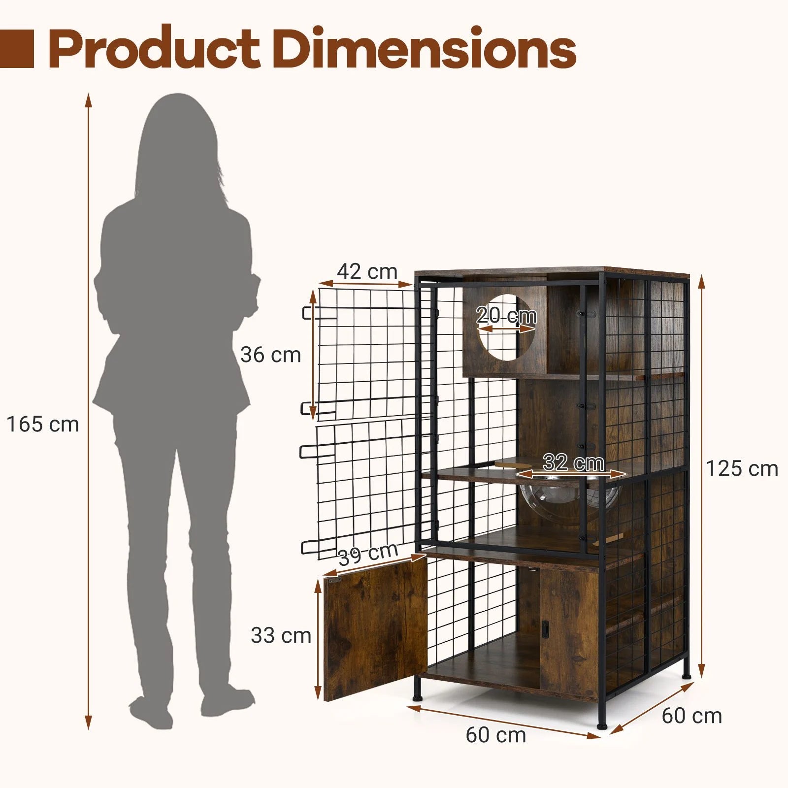 It features multiple platforms with partitioned areas for resting, playing, and eating, and a bottom cabinet with a lockable door for extra storage. This wooden pet furniture offers wide platforms, a comfy hammock, and cat holes for easy access between levels. The sturdy metal frame and thickened MDF ensure stability, while adjustable footpads keep it steady on any floor. The opening door with latch design allows for easy cleaning of the internal space, making maintenance a breeze. Measuring 60 x 60 x 125cm, its easy-to-clean surface and modern design will complement any room. Whether you have a feline friend or other small pets, this cage provides a comfortable and secure environment for them to thrive in.