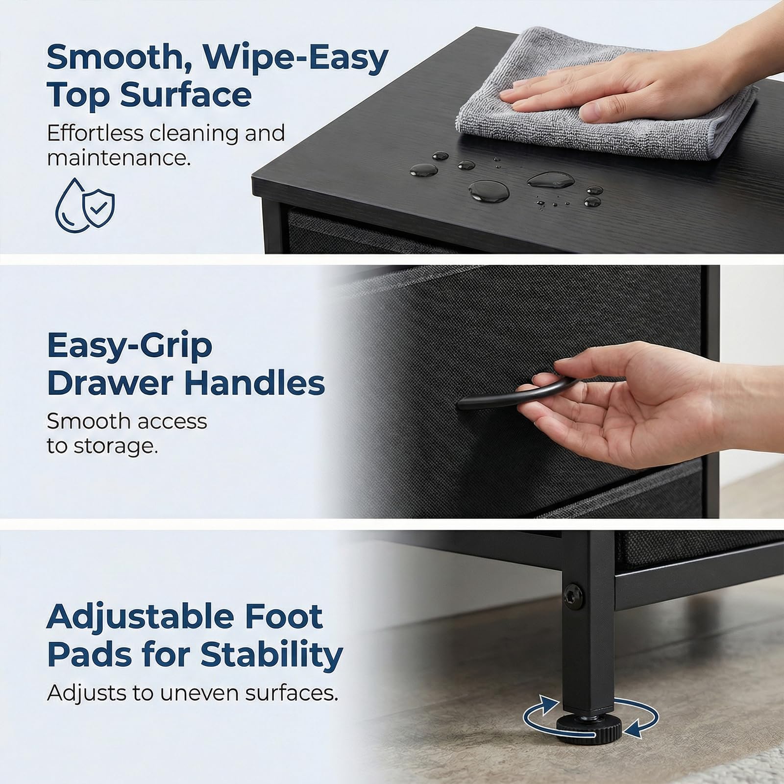 Its roomy tabletop complements 2 fabric drawers with convenient pull handles, offering ample space to neatly store your essentials. Crafted with a robust metal frame and adjustable foot pads, each piece provides stable support, eliminating unwanted wobble. The well-made details ensure long-lasting use. For added safety, 2 anti-tipping kits keep the units firmly anchored to the wall, giving you peace of mind in busy households. Cleaning is a breeze thanks to smooth surfaces and removable fabric drawers, making upkeep simple and quick.
