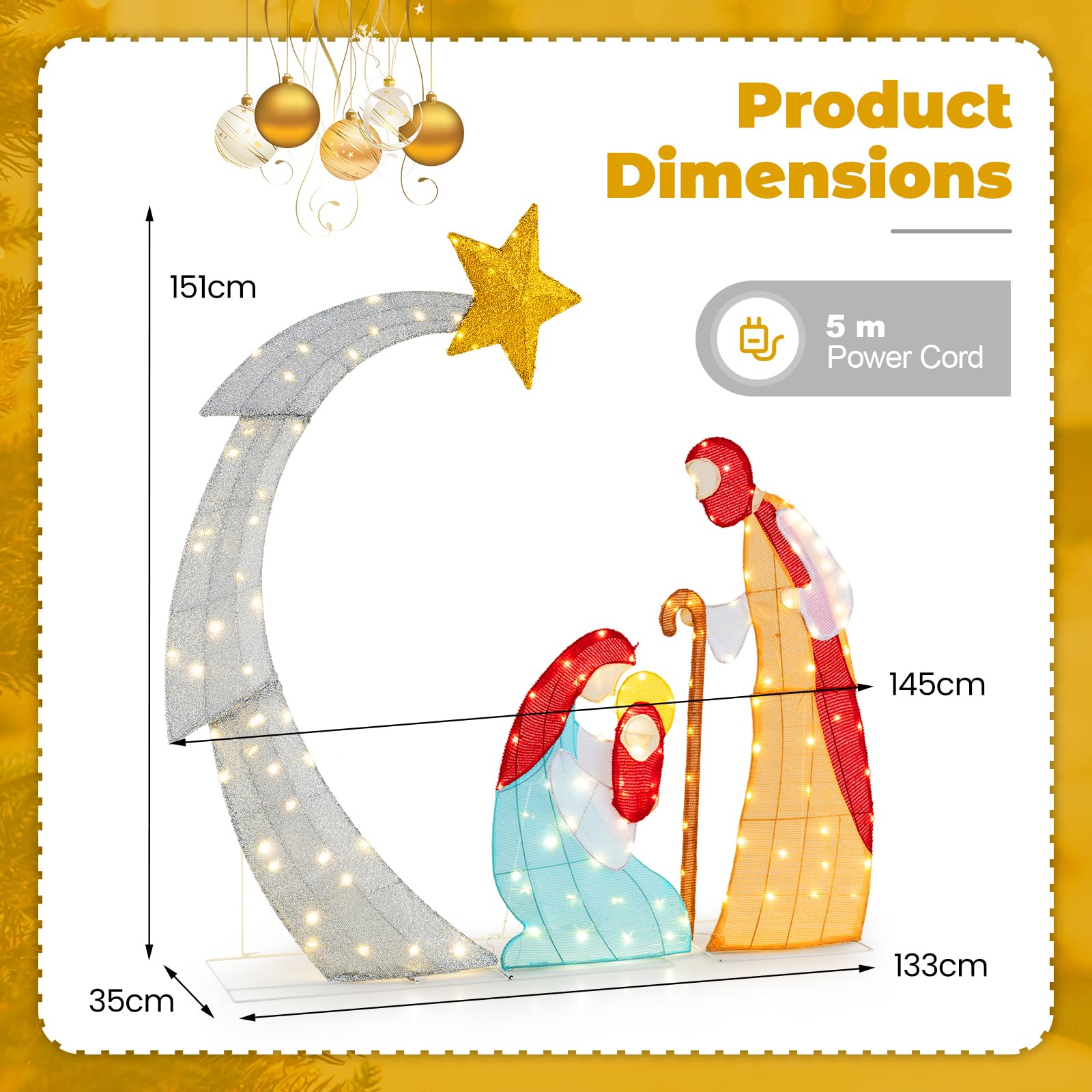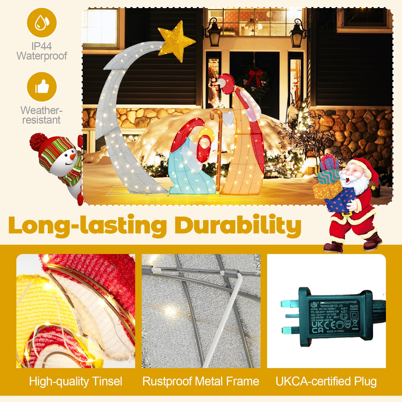 Transform your space into a sacred sanctuary with our captivating Nativity Display. Featuring lifelike figures of Jesus, Mary, and Joseph, intricately crafted to showcase the holiness of the season, this set is illuminated by 140 warm white LED lights, exuding a cozy glow that radiates festive charm. Built to withstand outdoor elements with premium tinsel and metal construction, this display stands sturdy with 12 ground stakes and 10 zip ties, ensuring stability. Perfect for adding a touch of holiday magic to your home or yard, it spreads joy and cheer while captivating all who behold its beauty.