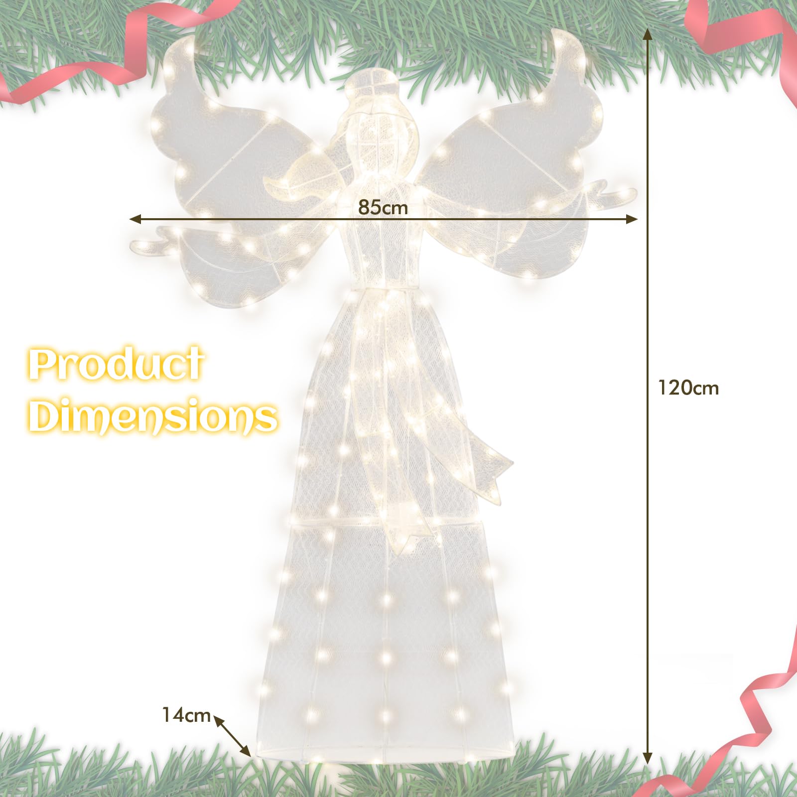 Glowing with 148 LED Lights: This angel shines brightly with 148 warm white LED lights, providing a soft, ambient glow that enhances the joyous atmosphere of Christmas. The energy-efficient lighting helps make this decoration a standout feature during the nighttime.