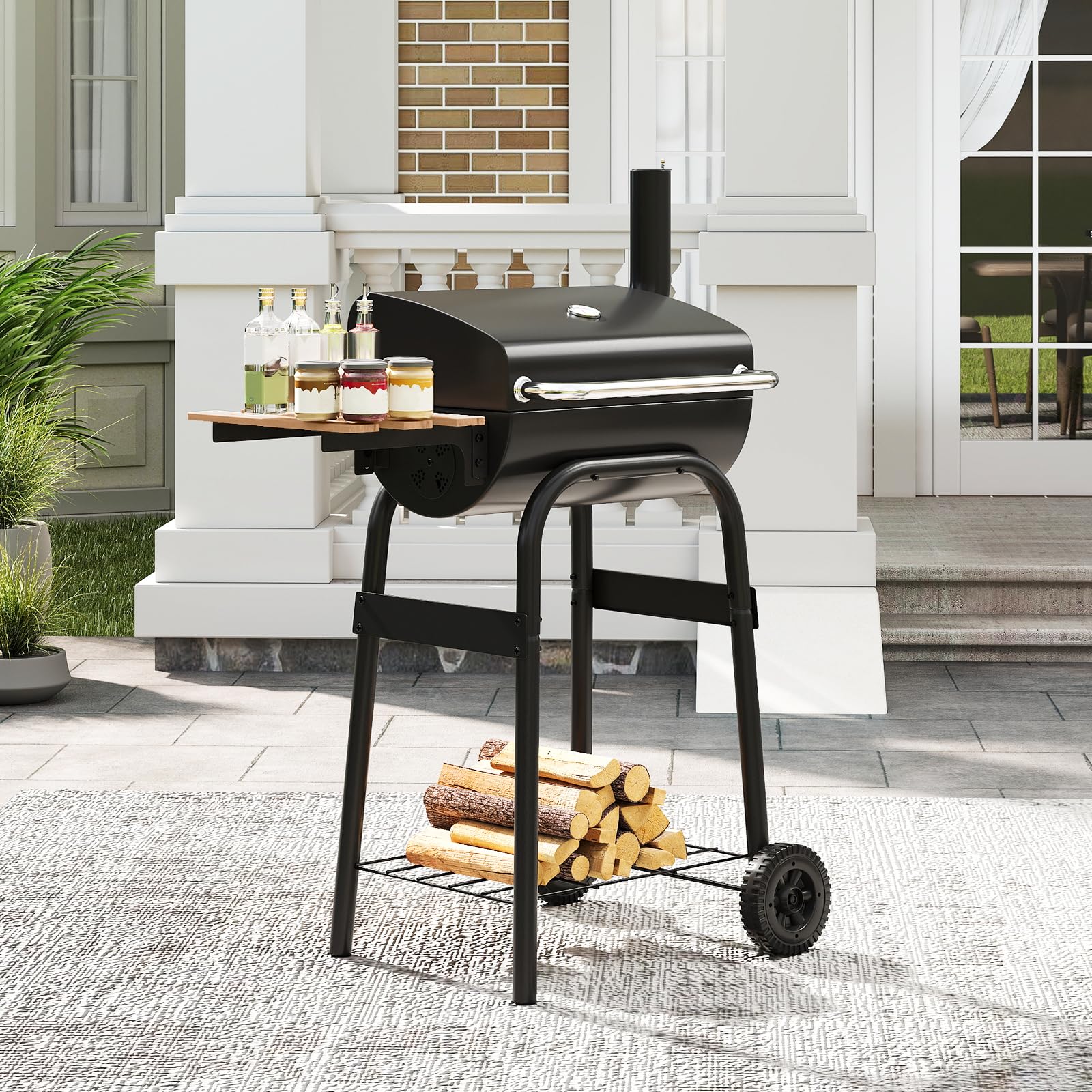 Its foldable side table and roomy bottom shelf turn your patio or campsite into an organized barbecue station, while smooth wheels let this barrel charcoal grill glide from backyard to tailgate effortlessly. A built-in thermostat, adjustable vents and chimney give the outside grill precise heat control. Additionally, the sufficient cooking surface is just right for hot dogs, steaks, wings and kebabs. After the feast, 2 dishwasher-safe cooking grates make cleanup quick.