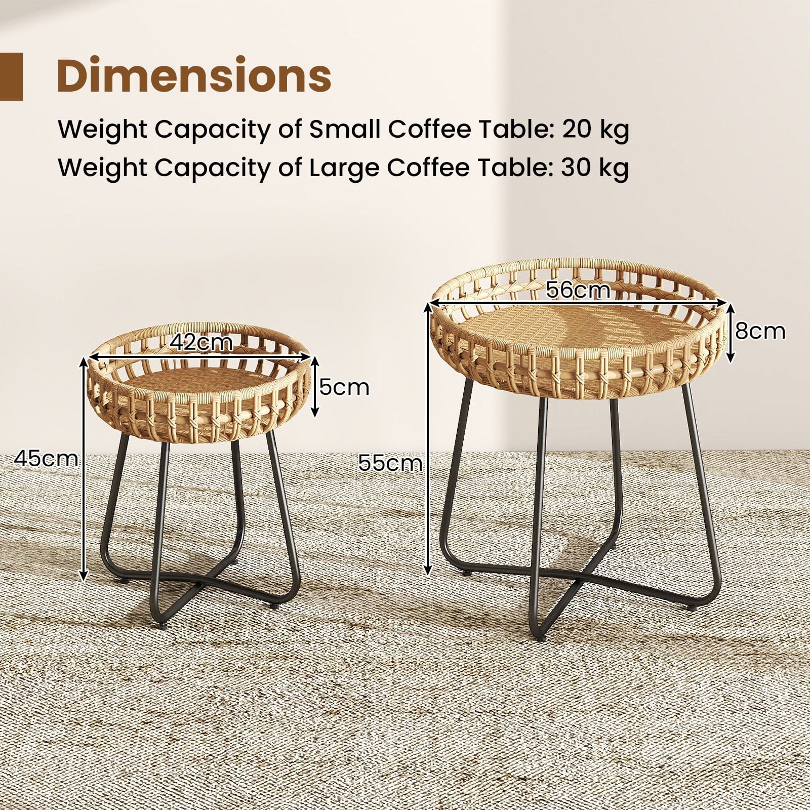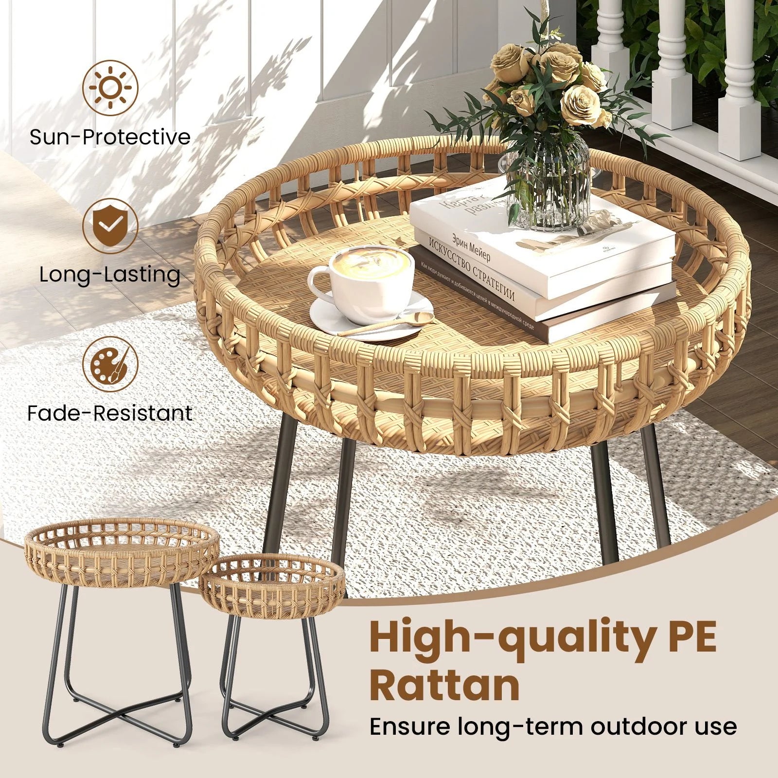 Outdoor Round Side Table Set of 2 in Different Sizes PE Wicker Tables with Sturdy Metal Frames