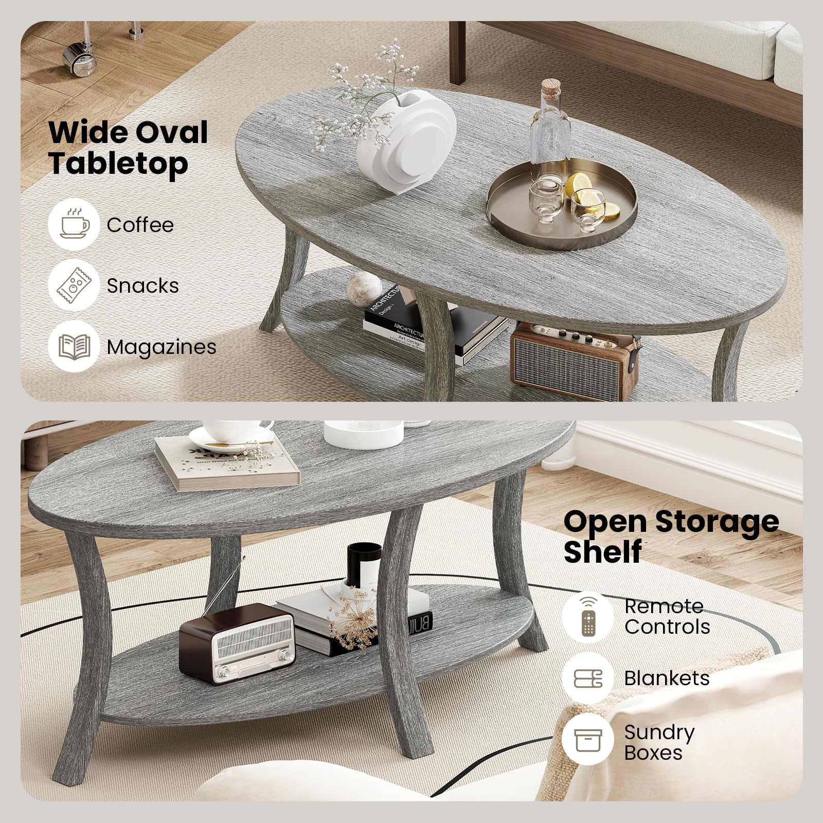 Oval Coffee Table 2-Tier Center Table with Storage Shelf