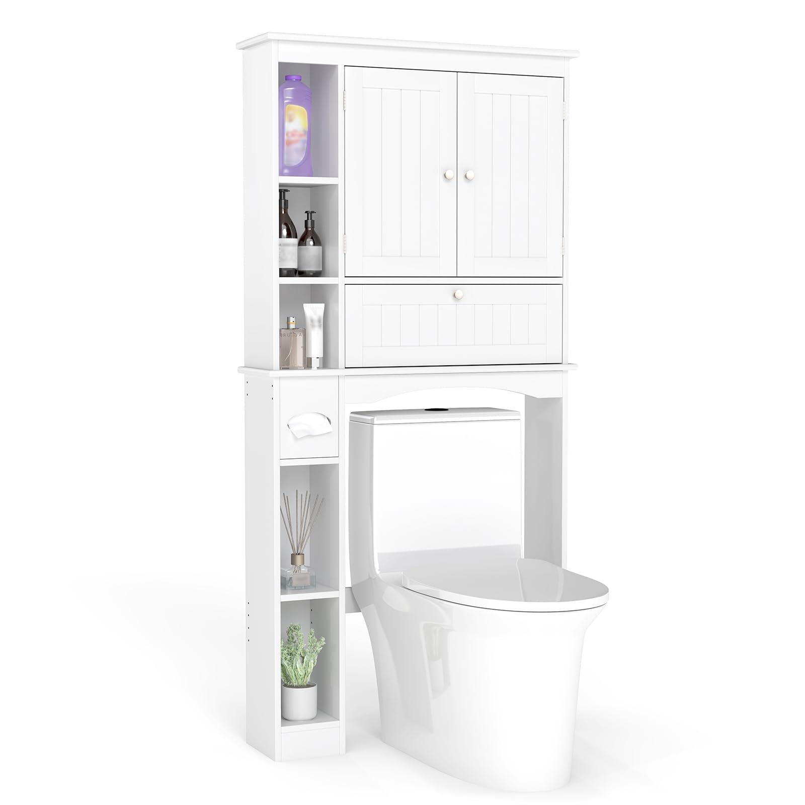 Choose between 2 setup options to match your room layout, 3 shelf heights for tallest bottles, and 3 bottom bar positions to fit over your pipes. With 5 open shelves, a drop-open cabinet, a dual-door storage, plus a built-in toilet paper holder, every item will find its place. Worried about stability? We’ve included anti-toppling devices to keep your things secure. Upgrade your routine with our over the toilet cabinet!
