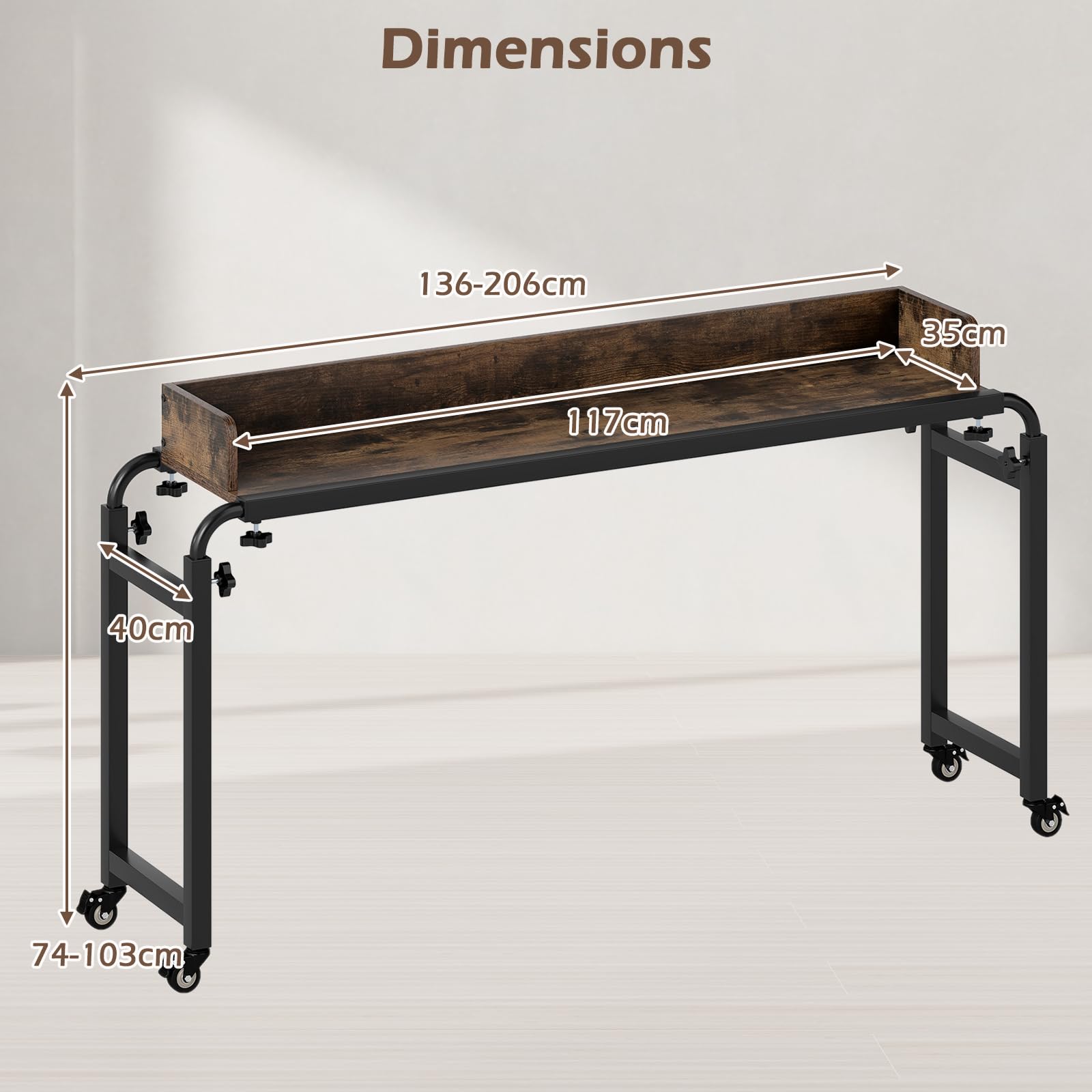 Overbed table with wheels, 136-206cm mobile over the bed table with anti-fall barrier