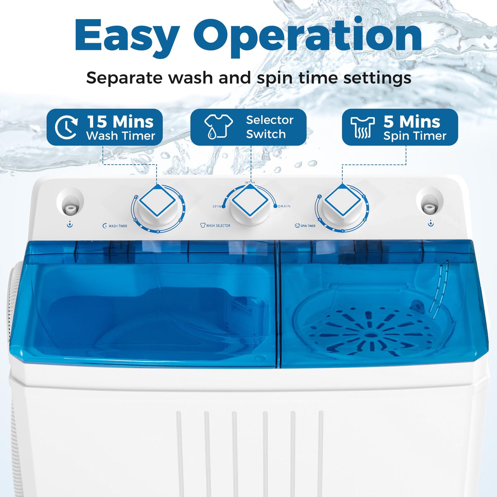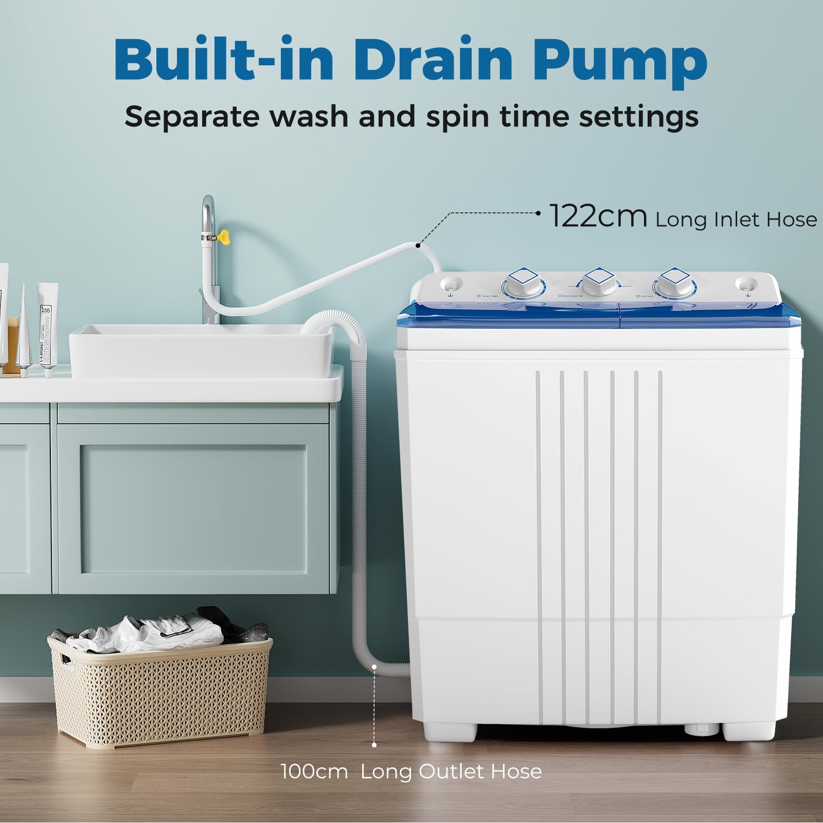 Twin Tub Design: This portable washing machine features a twin tub design for laundry convenience. You can directly move the washed clothes to the spinning tub for saving time. With 5kg wash capacity and 3kg spin capacity, it meets the laundry needs of the whole family, either for sheets, T-shirts, pants, and under-wear.