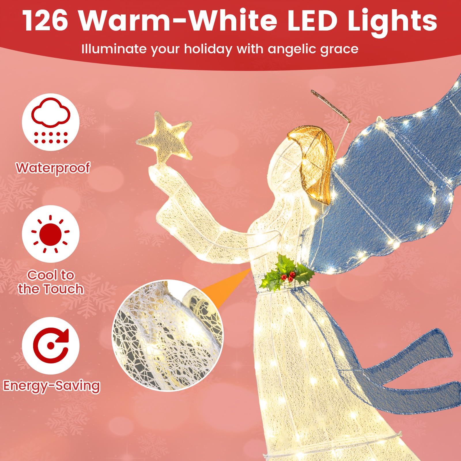 Illuminate your holiday with angelic grace with this lighted angel! Radiating with warm-white LED lights, the angel casts a cozy, inviting glow. Constructed with a sturdy metal frame, this pre-lit Christmas decoration offers lasting appeal and stability for both indoor and outdoor displays. Installation is straightforward with zip ties and ground stakes, while a UKCA -listed adapter ensures safe, reliable power. Perfect for homes, yards, porches, and shops, this 3D angel stands out day or night.