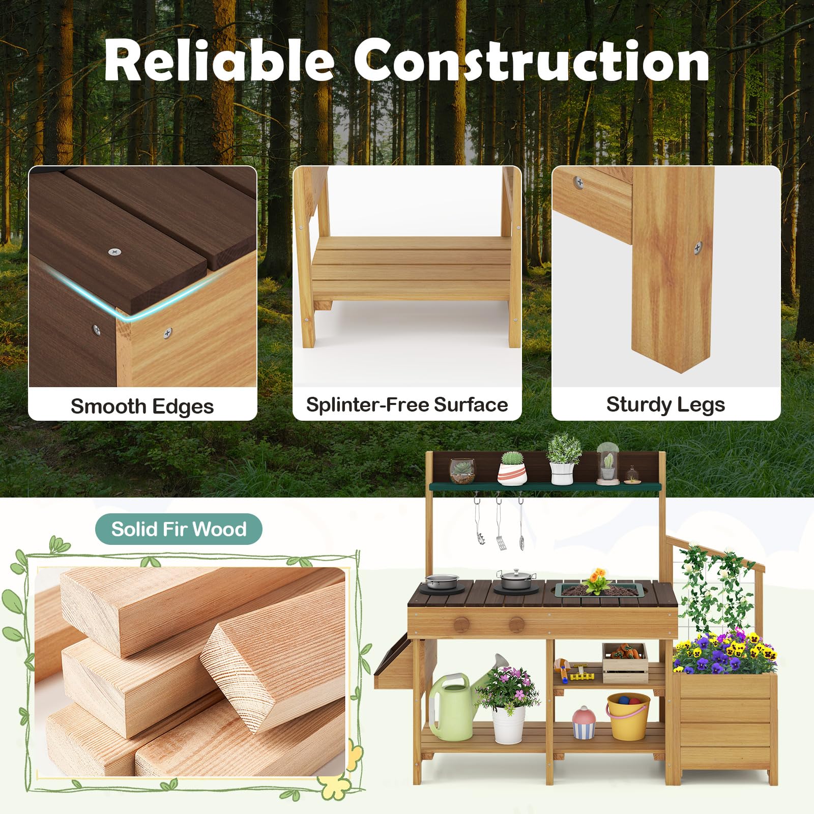 Wood Construction: The toy kitchen is crafted from fir wood, featuring sturdy legs for reliable stability, smooth edges for safety during play, and an easy-to-maintain surface. This thoughtful design ensures long-lasting fun and safety, allowing your child the freedom to explore and play without worry.