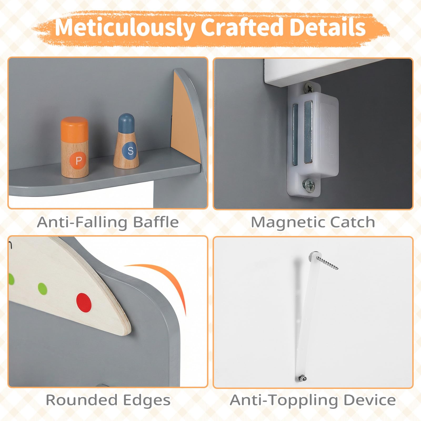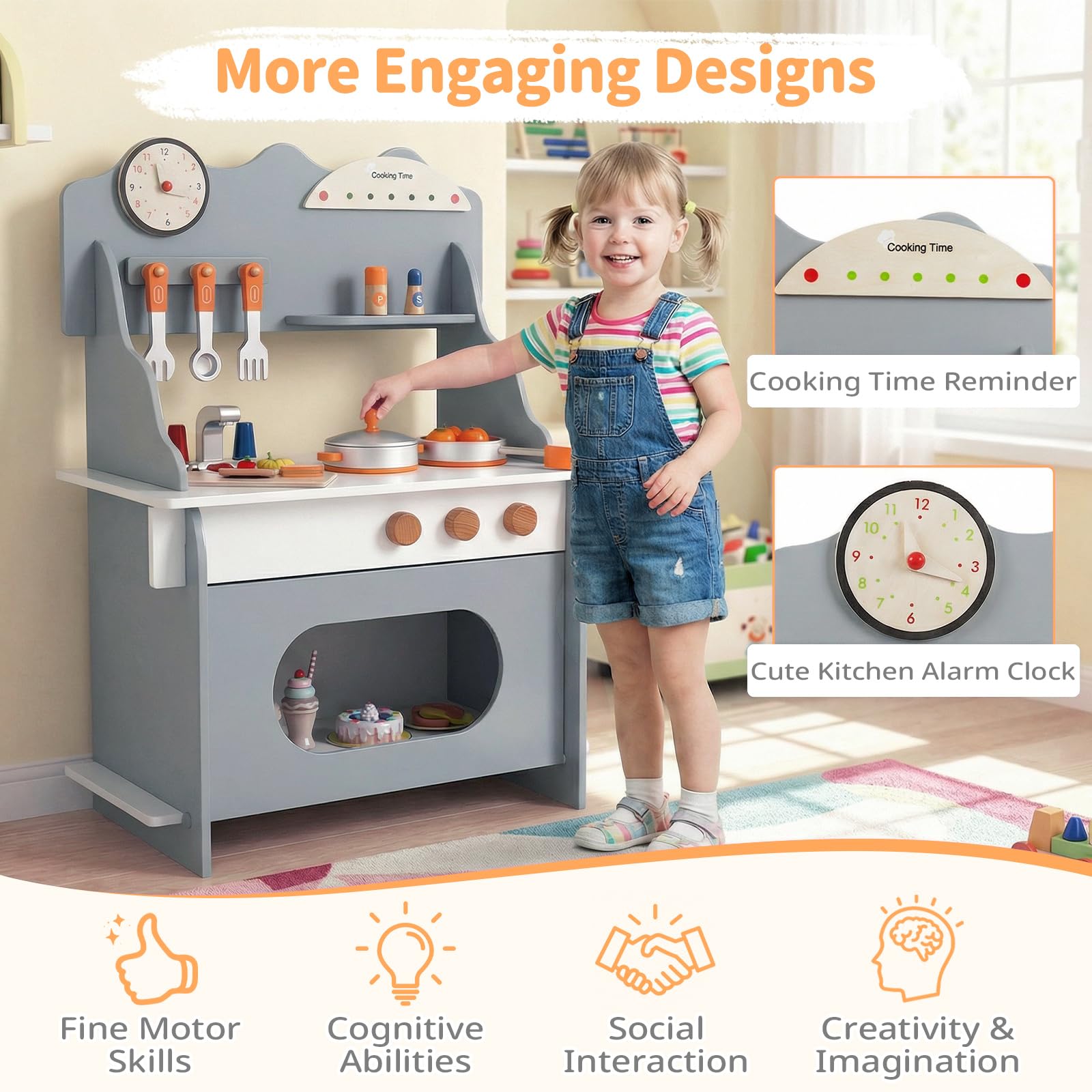 Stress-Free Storage: Everything has its place with a top spice rack, spacious countertop, 3 hanging hooks, and lower storage compartment for accessories. Kids learn to keep their play space tidy, building real-life organization skills while having fun.