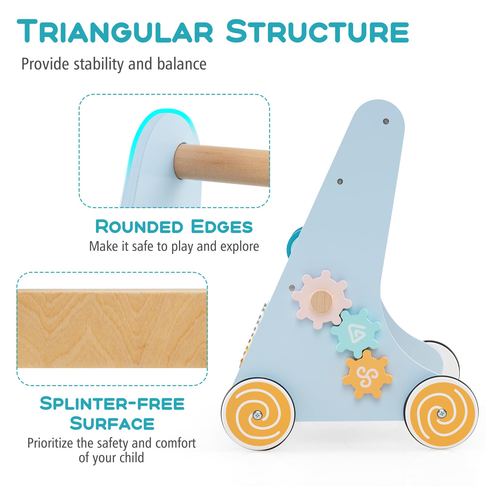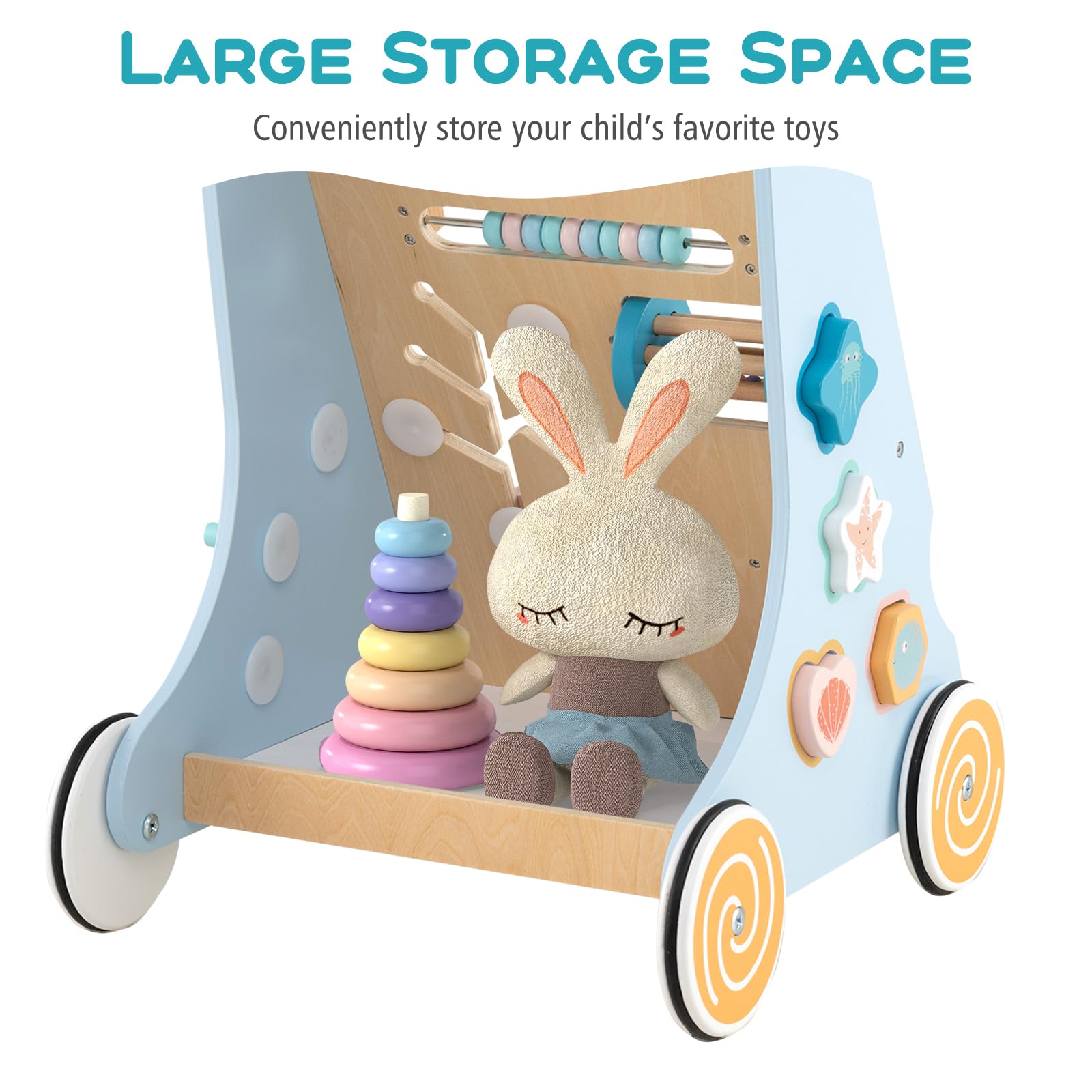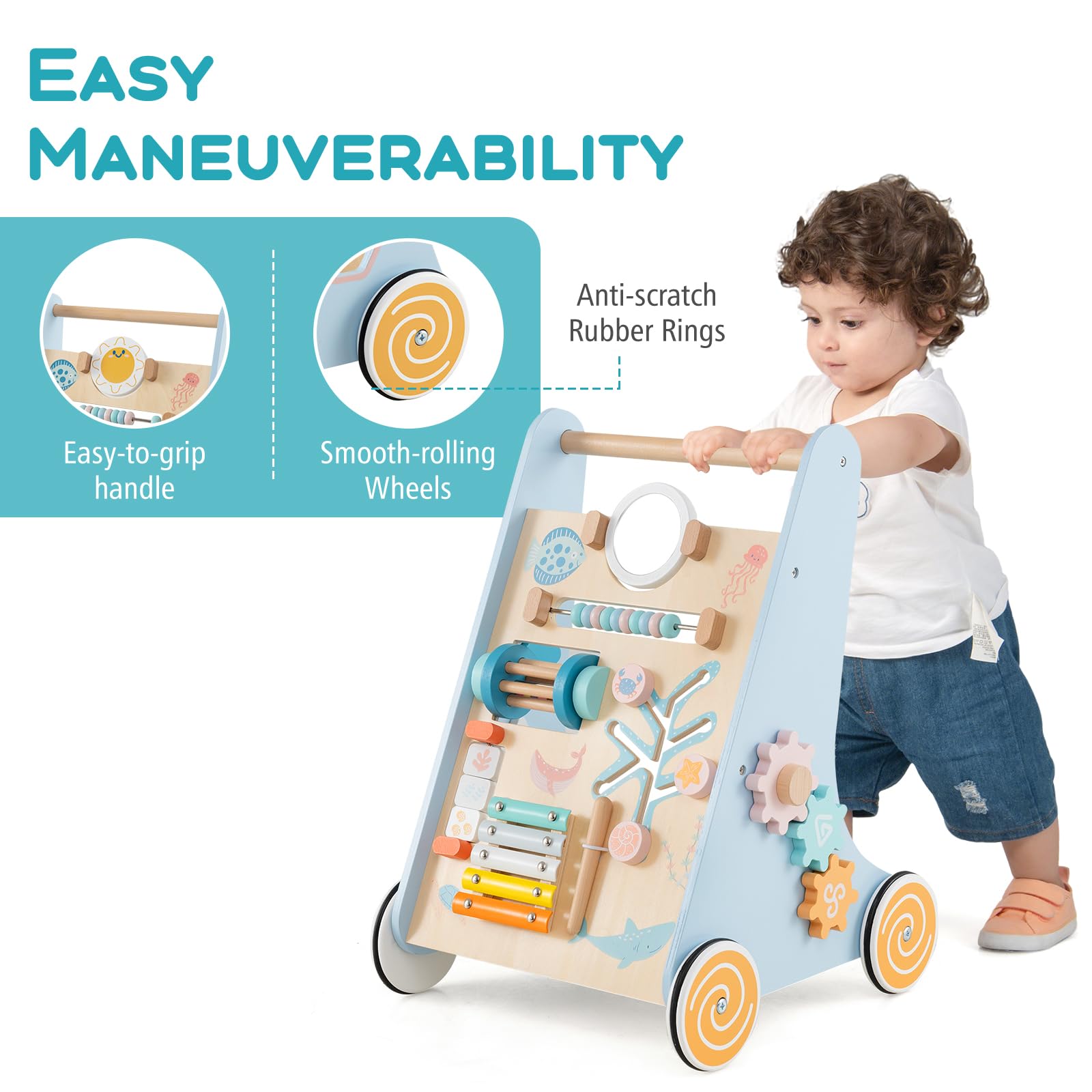 This 8-in-1 learning activity center boosts cognitive skills, balance and coordination through engaging features like a xylophone, rotating gears and more, all designed with child-safe, rounded edges and a splinter-free surface. Engineered with a robust triangular structure and equipped with smooth, rubber-ringed wheels, this walker toy ensures stable and scratch-free mobility. Also, it includes built-in storage space, promoting organizational skills while offering plenty of fun activities to foster creativity and imagination in your growing child.