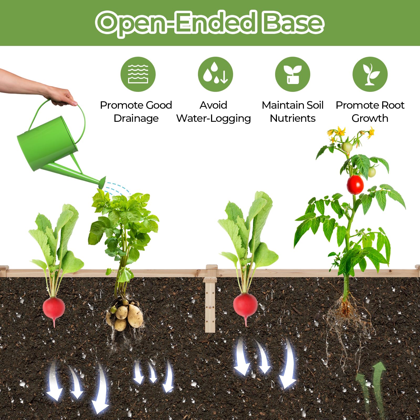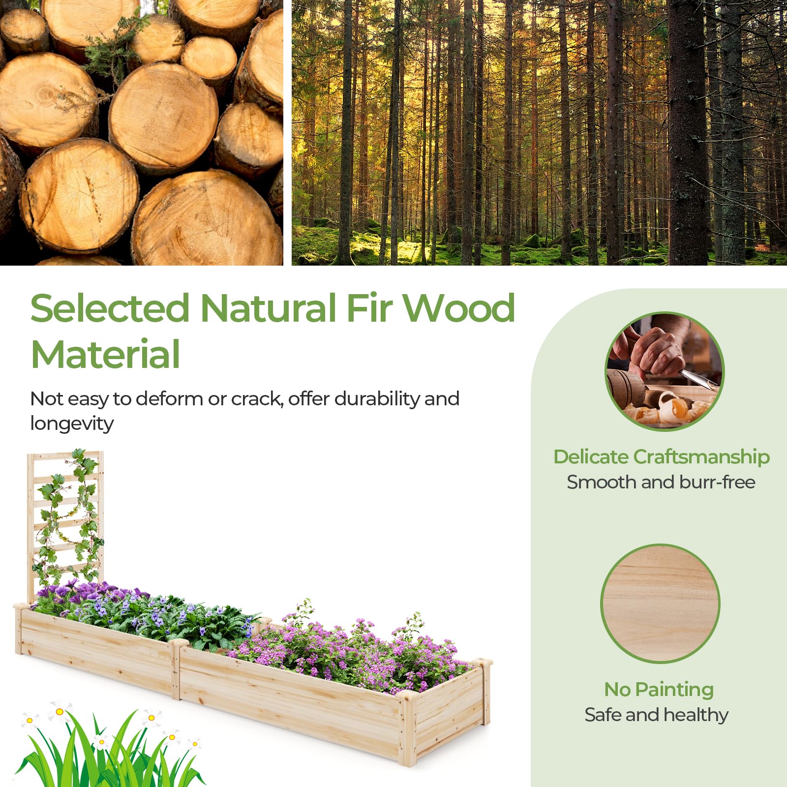 Naturally Durable Material: The raised garden bed is crafted with 100% natural fir wood, which is not easy to deform or crack, offering durability and longevity. Furthermore, the wood surface with no painting creates a safe and healthy growing environment.