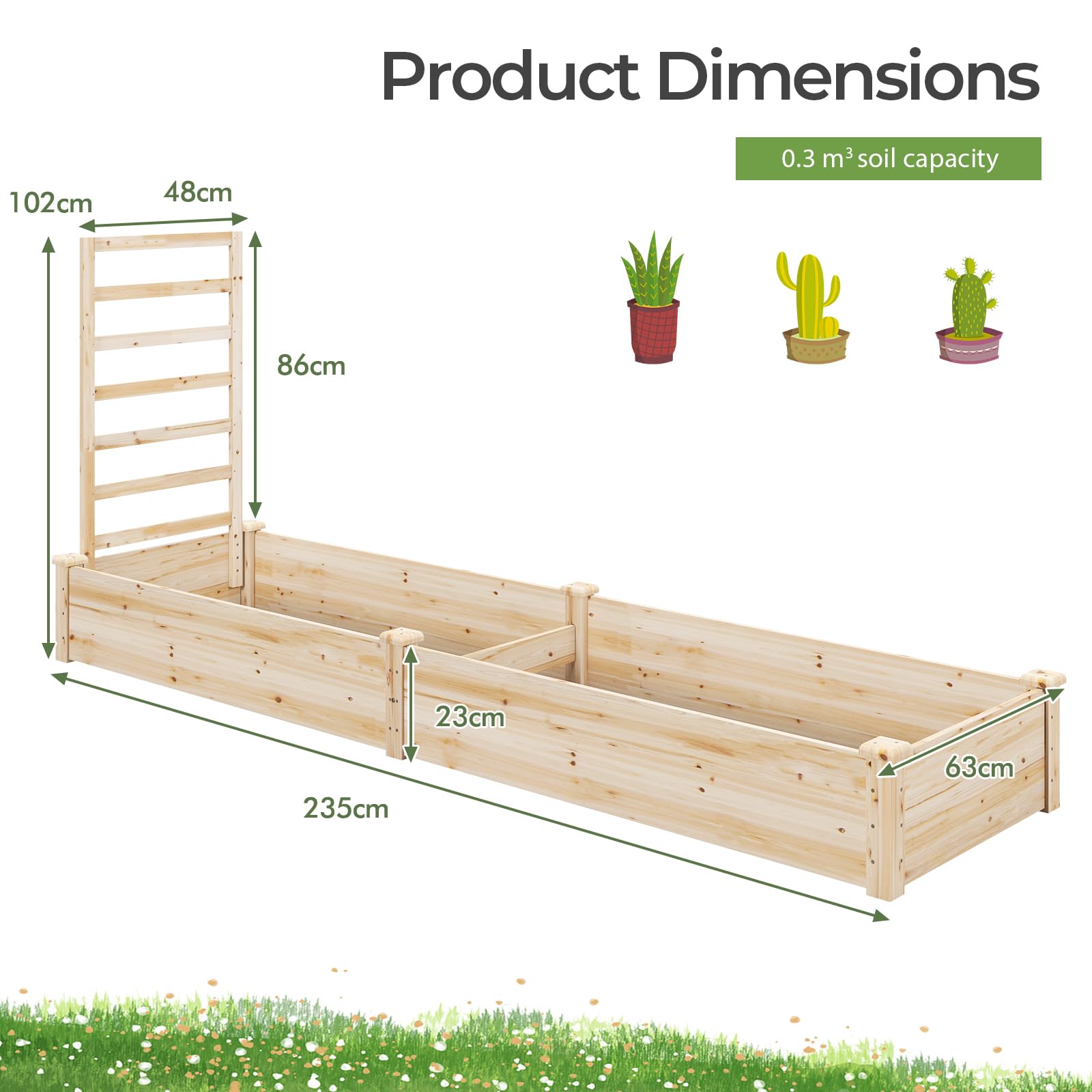 Stable Structure & Easy Assembly: This outdoor fir wood planter is constructed of 14 mm thick wood boards and the corners are reinforced, ensuring good stability and sturdiness. Besides, it adopts slotted legs, making assembly a breeze. It measures 235 x 63 x 102 cm (L x W x H) and the soil capacity is 0.3 m3.
